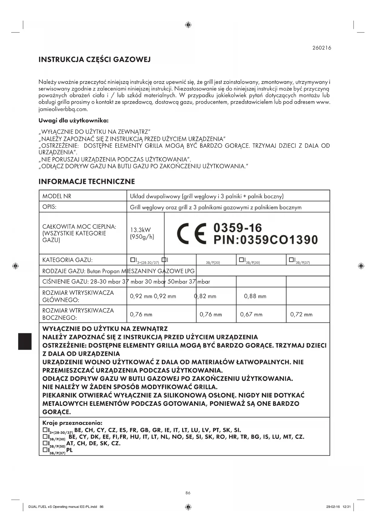 Należy uważnie przeczytać niniejszą instrukcję oraz upewnić się, że grill jest zainstalowany, zmontowany, utrzymywany i serwisowany zgodnie z zaleceniami niniejszej instrukcji. Niezastosowanie się do niniejszej instrukcji może być przyczyną poważnych obrażeń ciała i / lub szkód materialnych. W przypadku jakiekolwiek pytań dotyczących montażu lub obsługi grilla prosimy o kontakt ze sprzedawcą, dostawcą gazu, producentem, przedstawicielem lub pod adresem www. jamieoliverbbq.com. Uwagi dla użytkownika: „WYŁĄCZNIE DO UŻYTKU NA ZEWNĄTRZ” „NALEŻY ZAPOZNAĆ SIĘ Z INSTRUKCJĄ PRZED UŻYCIEM URZĄDZENIA” „OSTRZEŻENIE: DOSTĘPNE ELEMENTY GRILLA MOGĄ BYĆ BARDZO GORĄCE. TRZYMAJ DZIECI Z DALA OD URZĄDZENIA”. „NIE PORUSZAJ URZĄDZENIA PODCZAS UŻYTKOWANIA”. „ODŁĄCZ DOPŁYW GAZU NA BUTLI GAZU PO ZAKOŃCZENIU UŻYTKOWANIA.” INFORMACJE TECHNICZNE MODEL NR Układ dwupaliwowy (grill węglowy i 3 palniki + palnik boczny) OPIS: Grill węglowy oraz grill z 3 palnikami gazowymi z palnikiem bocznym CAŁKOWITA MOC CIEPLNA: (WSZYSTKIE KATEGORIE GAZU) 13.3kW (950g/h) KATEGORIA GAZU: