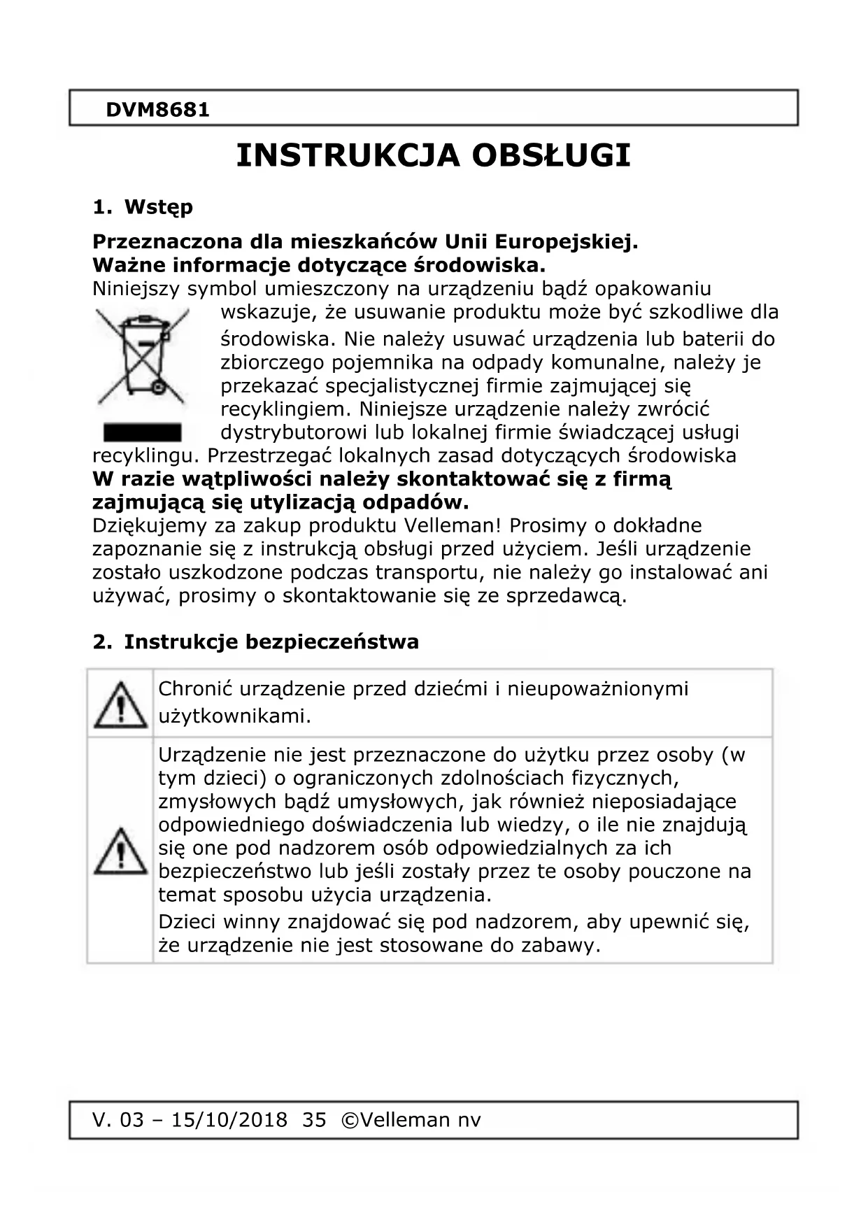 Przeznaczona dla mieszkańców Unii Europejskiej. Ważne informacje dotyczące środowiska. Niniejszy symbol umieszczony na urządzeniu bądź opakowaniu wskazuje, że usuwanie produktu może być szkodliwe dla środowiska. Nie należy usuwać urządzenia lub baterii do zbiorczego pojemnika na odpady komunalne, należy je przekazać specjalistycznej firmie zajmującej się recyklingiem. Niniejsze urządzenie należy zwrócić dystrybutorowi lub lokalnej firmie świadczącej usługi recyklingu. Przestrzegać lokalnych zasad dotyczących środowiska W razie wątpliwości należy skontaktować się z firmą zajmującą się utylizacją odpadów. Dziękujemy za zakup produktu Velleman! Prosimy o dokładne zapoznanie się z instrukcją obsługi przed użyciem. Jeśli urządzenie zostało uszkodzone podczas transportu, nie należy go instalować ani używać, prosimy o skontaktowanie się ze sprzedawcą.