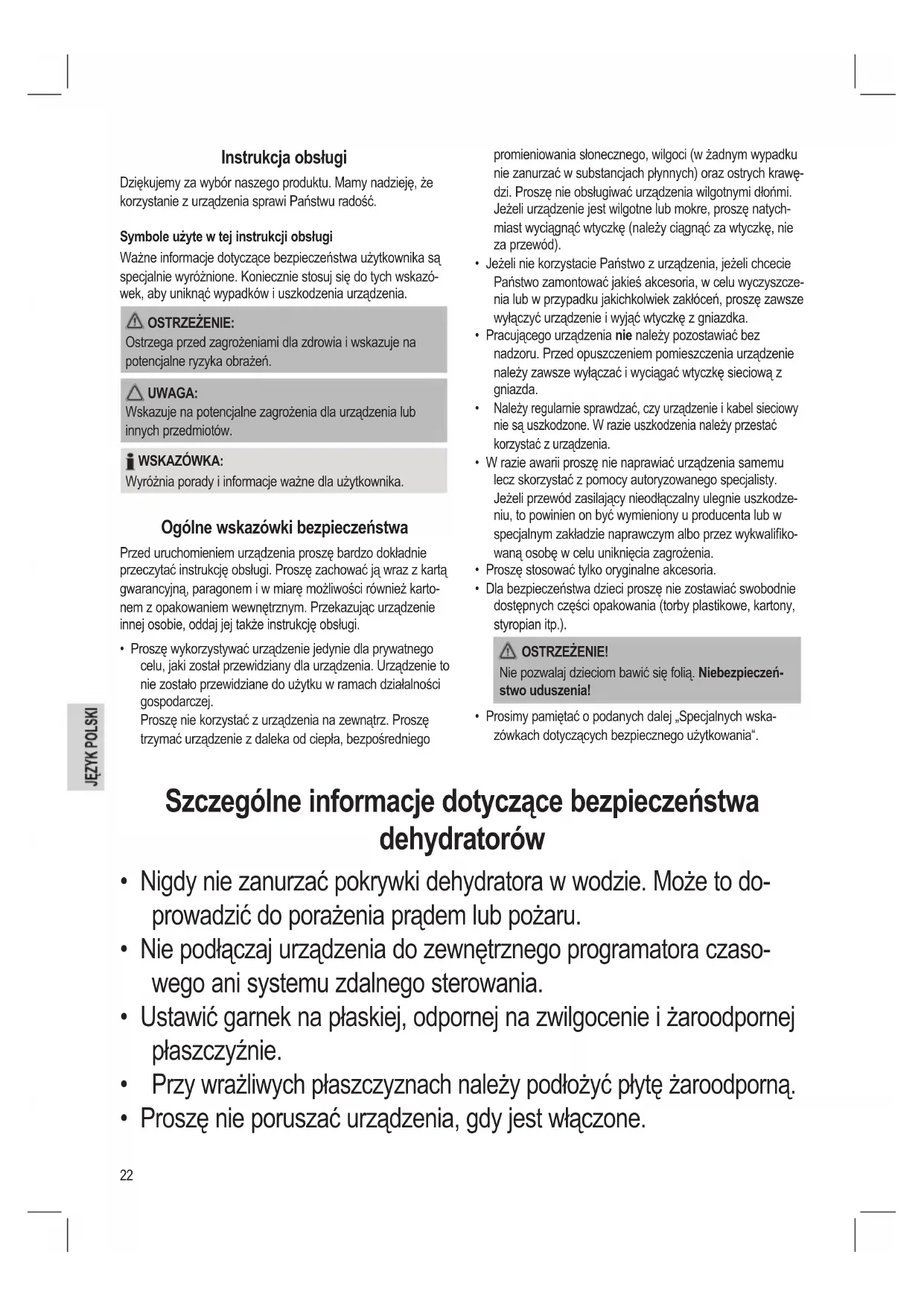 - Prosimy pamiętać o podanych dalej „Specjalnych wska- zówkach dotyczących bezpiecznego użytkowania“. Szczególne informacje dotyczące bezpieczeństwa dehydratorów