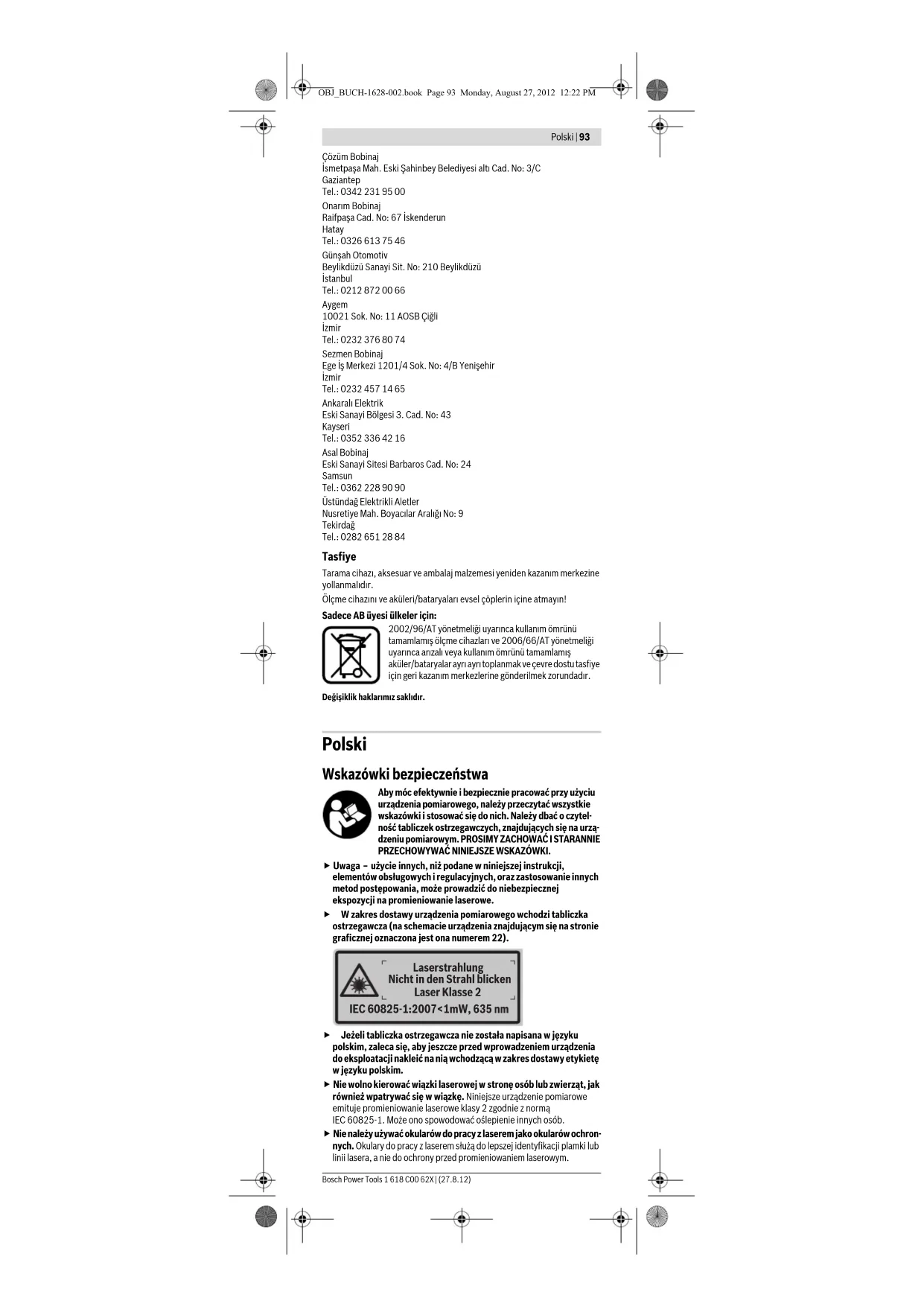 Denizli Tel.: 0258 262 06 66 Bulut Elektrik İstasyon Cad. No: 52/B Devlet Tiyatrosu Karşs Elazğ Tel.: 0424 218 35 59 Körfez Elektrik Sanayi Çarşs 770 Sok. No: 71 Erzincan Tel.: 0446 223 09 59 Ege Elektrik İnönü Bulvaro No: 135 Muğla Makasaras Fethiye Fethiye Tel.: 0252 614 57 01 Değer İş Bobinaj İsmetpaşa Mah. İlk Belediye Başkan Cad. 5/C Şahinbey Gaziantep Tel.: 0342 231 64 32 OBJ_BUCH-1628-002.book Page 92 Monday, August 27, 2012 12:22 PMPolski | 93 Bosch Power Tools 1 618 C00 62X | (27.8.12) Çözüm Bobinaj İsmetpaşa Mah. Eski Şahinbey Belediyesi alt Cad. No: 3/C Gaziantep Tel.: 0342 231 95 00 Onarm Bobinaj Raifpaşa Cad. No: 67 İskenderun Hatay Tel.: 0326 613 75 46 Günşah Otomotiv Beylikdüzü Sanayi Sit. No: 210 Beylikdüzü İstanbul Tel.: 0212 872 00 66 Aygem 10021 Sok. No: 11 AOSB Çiğli İzmir Tel.: 0232 376 80 74 Sezmen Bobinaj Ege İş Merkezi 1201/4 Sok. No: 4/B Yenişehir İzmir Tel.: 0232 457 14 65 Ankaral Elektrik Eski Sanayi Bölgesi 3. Cad. No: 43 Kayseri Tel.: 0352 336 42 16 Asal Bobinaj Eski Sanayi Sitesi Barbaros Cad. No: 24 Samsun Tel.: 0362 228 90 90 Üstündağ Elektrikli Aletler Nusretiye Mah. Boyaclar Aralğ No: 9 Tekirdağ Tel.: 0282 651 28 84 Tasfiye Tarama cihaz, aksesuar ve ambalaj malzemesi yeniden kazanm merkezine yollanmaldr. Ölçme cihazn ve aküleri/bataryalar evsel çöplerin içine atmayn! Sadece AB üyesi ülkeler için: 2002/96/AT yönetmeliği uyarnca kullanm ömrünü tamamlamş ölçme cihazlar ve 2006/66/AT yönetmeliği uyarnca arzal veya kullanm ömrünü tamamlamş aküler/bataryalar ayr ayr toplanmak ve çevre dostu tasfiye için geri kazanm merkezlerine gönderilmek zorundadr. Değişiklik haklarmz sakldr. Polski Wskazówki bezpieczeństwa Aby móc efektywnie i bezpiecznie pracować przy użyciu urządzenia pomiarowego, należy przeczytać wszystkie wskazówki i stosować się do nich. Należy dbać o czytel- ność tabliczek ostrzegawczych, znajdujących się na urzą- dzeniu pomiarowym. PROSIMY ZACHOWAĆ I STARANNIE PRZECHOWYWAĆ NINIEJSZE WSKAZÓWKI. f Uwaga – użycie innych, niż podane w niniejszej instrukcji, elementów obsługowych i regulacyjnych, oraz zastosowanie innych metod postępowania, może prowadzić do niebezpiecznej ekspozycji na promieniowanie laserowe. f W zakres dostawy urządzenia pomiarowego wchodzi tabliczka ostrzegawcza (na schemacie urządzenia znajdującym się na stronie graficznej oznaczona jest ona numerem 22). f Jeżeli tabliczka ostrzegawcza nie została napisana w języku polskim, zaleca się, aby jeszcze przed wprowadzeniem urządzenia do eksploatacji nakleić na nią wchodzącą w zakres dostawy etykietę w języku polskim. f Nie wolno kierować wiązki laserowej w stronę osób lub zwierząt, jak również wpatrywać się w wiązkę. Niniejsze urządzenie pomiarowe emituje promieniowanie laserowe klasy 2 zgodnie z normą IEC 60825-1. Może ono spowodować oślepienie innych osób. f Nie należy używać okularów do pracy z laserem jako okularów ochron- nych. Okulary do pracy z laserem służą do lepszej identyfikacji plamki lub linii lasera, a nie do ochrony przed promieniowaniem laserowym. IEC 60825-1:2007<1mW, 635 nm Laserstrahlung Nicht in den Strahl blicken Laser Klasse 2 OBJ_BUCH-1628-002.book Page 93 Monday, August 27, 2012 12:22 PM94 | Polski 1 618 C00 62X | (27.8.12) Bosch Power Tools f Nie należy stosować okularów do pracy z laserem jako okularów słonecznych, ani używać ich w ruchu drogowym. Okulary do pracy z laserem nie zapewniają całkowitej ochrony przed promieniowaniem UV i utrudniają rozróżnianie kolorów. f Napraw urządzenia pomiarowego powinien dokonywać jedynie wykwalifikowany personel, przy użyciu oryginalnych części zamien- nych. Tylko w ten sposób można zapewnić bezpieczną eksploatację przyrządu. f Nie wolno udostępniać laserowego urządzenia pomiarowego do użytkowania dzieciom. Mogą one nieumyślnie oślepić siebie lub inne osoby. f Nie należy stosować tego urządzenia pomiarowego w otoczeniu zagrożonym wybuchem, w którym znajdują się łatwopalne ciecze, gazy lub pyły. W urządzeniu pomiarowym może dojść do utworzenia iskier, które mogą spowodować zapłon pyłów lub oparów. Nie trzymać urządzenia pomiarowego w pobliżu roz- ruszników serca. Magnesy 14 wytwarzają pole, które może zakłócić działanie rozrusznika serca. f Przechowywać urządzenie pomiarowe z dala od magnetycznych nośników danych oraz urządzeń wrażliwych magnetycznie. Pod wpływem działania magnesów 14 może dojść do nieodwracalnej utraty danych. Opis urządzenia i jego zastosowania Proszę rozłożyć stronę z graficznym przedstawieniem urządzenia pomiarowego i pozostawić ją rozłożoną podczas czytania instrukcji obsługi. Użycie zgodne z przeznaczeniem Urządzenie pomiarowe przeznaczone jest do precyzyjnych pomiarów i do przenoszenia tras pochyłych. Urządzenie pomiarowe zostało zoptymalizowanet do zastosowań wewnątrz pomieszczeń. Przedstawione graficznie komponenty Numeracja przedstawionych komponentów odnosi się do schematu urządzenia pomiarowego, znajdującego się na stronie graficznej. 1 Przycisk sygnalizatora dźwiękowego 2 Włącznik/wyłącznik dla pomiaru kąta nachylenia/wyświetlacza 3 Przycisk zmiany punktu zerowego „Alt 0°“ 4 Przycisk kalibracji/ podwyższenia wartości wskaźnika „CAL“ 5 Przycisk zmiany jednostki miary/zmniejszenia wartości wskaźnika „° / % / mm/m“ 6 Przycisk „Hold/Copy“ 7 Pokrywka wnęki na baterie funkcji pomiaru kąta nachylenia 8 Przycisk do wysunięcia stopki poziomującej 9 Śruba regulacyjna stopki poziomującej 10 Przełącznik do wsunięcia stopki poziomującej 11 Wyświetlacz 12 Poziomnica pionowa 13 Poziomnica pionowa 14 Magnesy 15 Prowadnica pasa 16 Noga 17 Stopka poziomująca 18 Przyłącze do statywu 1/4" 19 Włącznik/wyłącznik lasera 20 Pokrywka wnęki na baterie lasera 21 Otwór wyjściowy wiązki laserowej 22 Tabliczka ostrzegawcza lasera 23