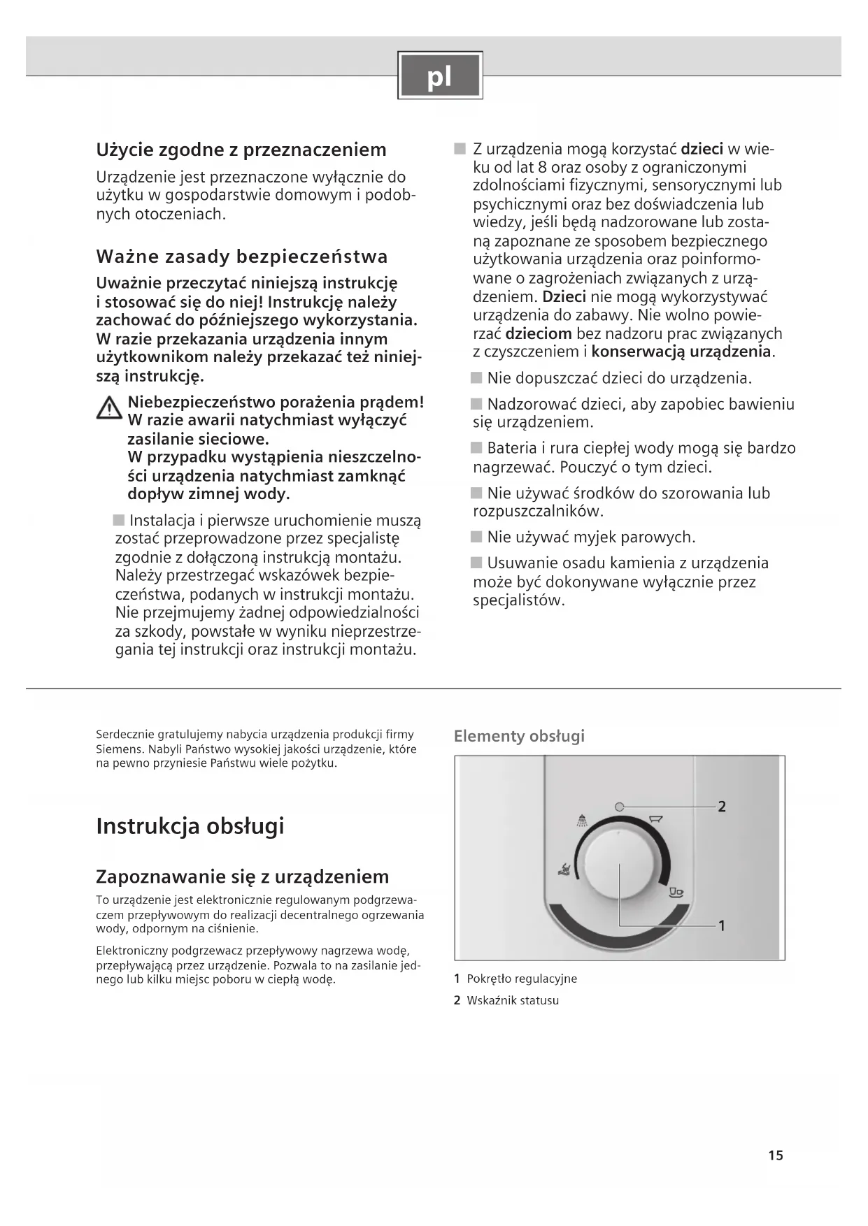 Użycie zgodne z przeznaczeniem Urządzenie jest przeznaczone wyłącznie do użytku w gospodarstwie domowym i podob- nych otoczeniach. Ważne zasady bezpieczeństwa Uważnie przeczytać niniejszą instrukcję i stosować się do niej! Instrukcję należy zachować do późniejszego wykorzystania. W razie przekazania urządzenia innym użytkownikom należy przekazać też niniej- szą instrukcję. Niebezpieczeństwo porażenia prądem! W razie awarii natychmiast wyłączyć zasilanie sieciowe. W przypadku wystąpienia nieszczelno- ści urządzenia natychmiast zamknąć dopływ zimnej wody. ■ Instalacja i pierwsze uruchomienie muszą zostać przeprowadzone przez specjalistę zgodnie z dołączoną instrukcją montażu. Należy przestrzegać wskazówek bezpie- czeństwa, podanych w instrukcji montażu. Nie przejmujemy żadnej odpowiedzialności za szkody, powstałe w wyniku nieprzestrze- gania tej instrukcji oraz instrukcji montażu. ■ Z urządzenia mogą korzystać dzieci w wie- ku od lat 8 oraz osoby z ograniczonymi zdolnościami fizycznymi, sensorycznymi lub psychicznymi oraz bez doświadczenia lub wiedzy, jeśli będą nadzorowane lub zosta- ną zapoznane ze sposobem bezpiecznego użytkowania urządzenia oraz poinformo- wane o zagrożeniach związanych z urzą- dzeniem. Dzieci nie mogą wykorzystywać urządzenia do zabawy. Nie wolno powie- rzać dzieciom bez nadzoru prac związanych z czyszczeniem i konserwacją urządzenia. ■ Nie dopuszczać dzieci do urządzenia. ■ Nadzorować dzieci, aby zapobiec bawieniu się urządzeniem. ■ Bateria i rura ciepłej wody mogą się bardzo nagrzewać. Pouczyć o tym dzieci. ■ Nie używać środków do szorowania lub rozpuszczalników. ■ Nie używać myjek parowych. ■ Usuwanie osadu kamienia z urządzenia może być dokonywane wyłącznie przez specjalistów. Serdecznie gratulujemy nabycia urządzenia produkcji firmy Siemens. Nabyli Państwo wysokiej jakości urządzenie, które na pewno przyniesie Państwu wiele pożytku. Instrukcja obsługi Zapoznawanie się z urządzeniem To urządzenie jest elektronicznie regulowanym podgrzewa-czem przepływowym do realizacji decentralnego ogrzewania wody, odpornym na ciśnienie.Elektroniczny podgrzewacz przepływowy nagrzewa wodę, przepływającą przez urządzenie. Pozwala to na zasilanie jed-nego lub kilku miejsc poboru w ciepłą wodę. Elementy obsługi