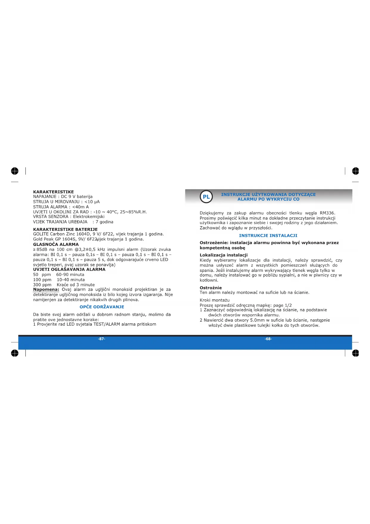 prekidača TSET/ALARM jednom tjedno. 2 Uređ aj uklonite s nosača i očistite poklopac alarma i otvore mekanom četkom jednom mjesečno radi uklanjanja prašine i prljavštine. 3 Nikada ne koristite deterdžente ili druga otapala za čišćenje uređ aja. 4 Izbjegavajte raspršivanje osvježivača zraka, spreja za kosu ili drugih sprejeva u blizini alarma. 5 Nemojte obojiti uređ aj. Boja će zatvoriti otvore i ometat će sposobnost senzora da detektira ugljični monoksid. Nikada ne pokušavajte rastaviti uređaj ili ga očistiti iznutra. Ova radnja će poništiti jamstvo. 6 Što je prije moguće, alarm vratite natrag na njegovo pravo mjesto kako biste osigurali stalnu zaštitu od trovanja ugljičnim monoksidom. 7 Kada se koriste kućna sredstva za čišćenje ili slični zagađ ivači, prostor se treba provjetravati. Upozorenje: Sljedeće tvari mogu utjecati na senzor i uzrokovati lažna očitanja: Metan, propan, butan, izobuten, izopropanol, etilen, benzen, toluen, etil acetat, sumporovodik, sumpor dioksid, proizvodi na bazi alkohola, razrjeđivači, otapala, ljepila, sprejevi za kosu, sredstvo nakon brijanja, parfemi i neka sredstva za čišćenje. Upozorenje: Vaš CO alarm neće raditi i neće nadzirati razine CO bez baterije. Upozorenje: Opasno je da se alarm nepropisno izmijeni Upozorenje: Alarm ne može spriječiti kronične efekte izlaganja CO Upozorenje: Alarm ne štiti pojedince od konkretnog rizika-68- Dziękujemy za zakup alarmu obecności tlenku węgla RM336. Prosimy poświęcić kilka minut na dokładne przeczytanie instrukcji użytkownika i zapoznanie siebie i swojej rodziny z jego działaniem. Zachować do wglądu w przyszłości. Ostrzeżenie: instalacja alarmu powinna być wykonana przez kompetentną osobę Lokalizacja instalacji Kiedy wybieramy lokalizacje dla instalacji, należy sprawdzić, czy można usłyszeć alarm z wszystkich pomieszczeń służących do spania. Jeśli instalujemy alarm wykrywający tlenek węgla tylko w domu, należy instalować go w pobliżu sypialni, a nie w piwnicy czy w kotłowni. Ostrożnie Ten alarm należy montować na suficie lub na ścianie. Kroki montażu Proszę sprawdzić odręczną mapkę: page 1/2 1 Zaznaczyć odpowiednią lokalizację na ścianie, na podstawie dwóch otworów wspornika alarmu. 2 Nawiercić dwa otwory 5.0mm w suficie lub ścianie, następnie włożyć dwie plastikowe tulejki kołka do tych otworów. INSTRUKCJE INSTALACJI