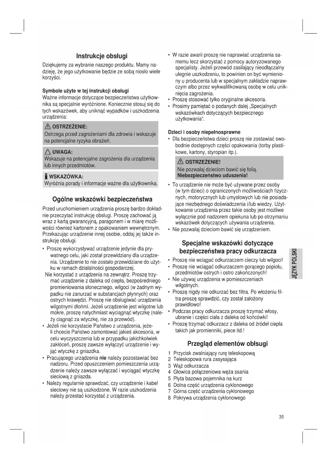 - Nie pozwalaj dzieciom bawić się urządzeniem. Specjalne wskazówki dotyczące bezpieczeństwa pracy odkurzacza