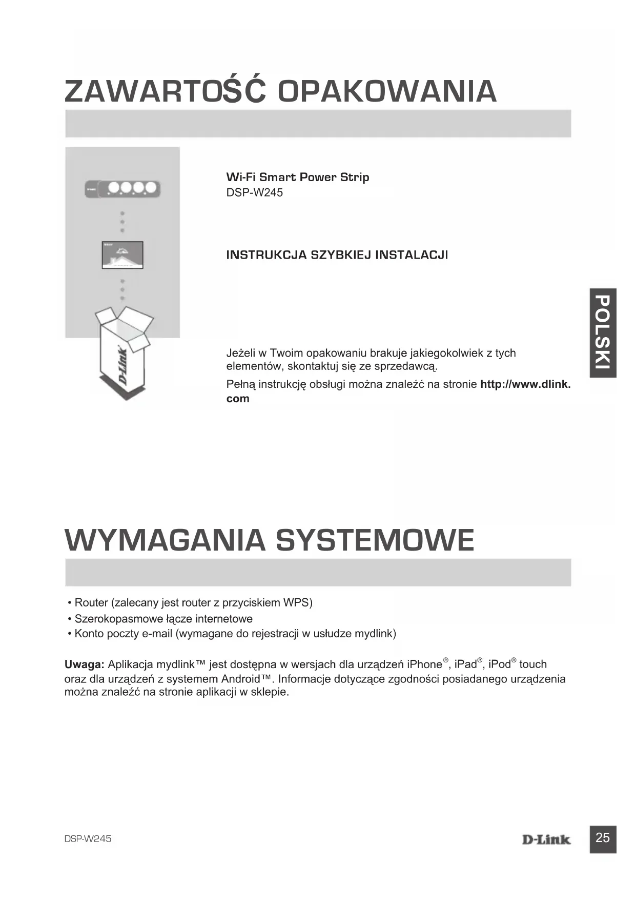 touch oraz dla urządzeń z systemem Android™. Informacje dotyczące zgodności posiadanego urządzenia można znaleźć na stronie aplikacji w sklepie. Jeżeli w Twoim opakowaniu brakuje jakiegokolwiek z tych elementów, skontaktuj się ze sprzedawcą. Pełną instrukcję obsługi można znaleźć na stronie http://www.dlink. com
