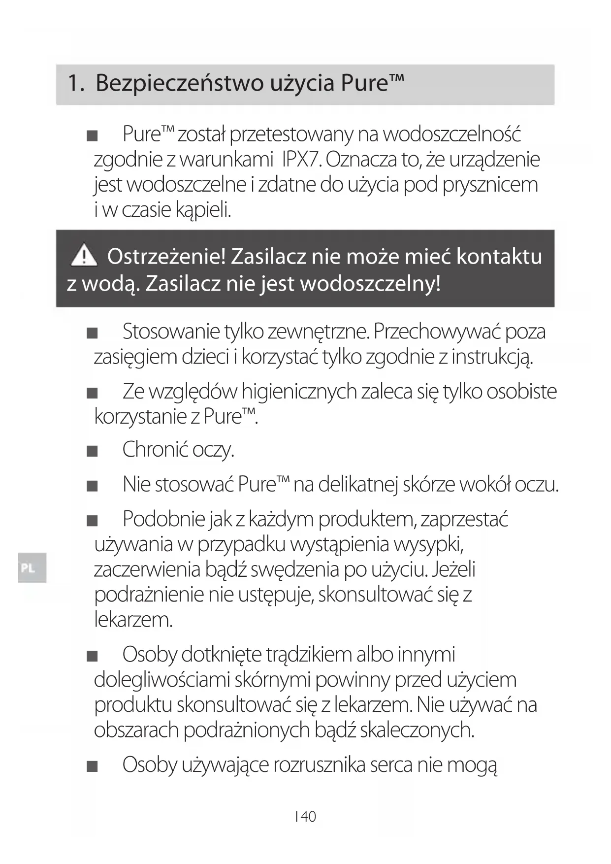 Pure™ został przetestowany na wodoszczelność zgodnie z warunkami IPX7. Oznacza to, że urządzenie jest wodoszczelne i zdatne do użycia pod prysznicem i w czasie kąpieli.