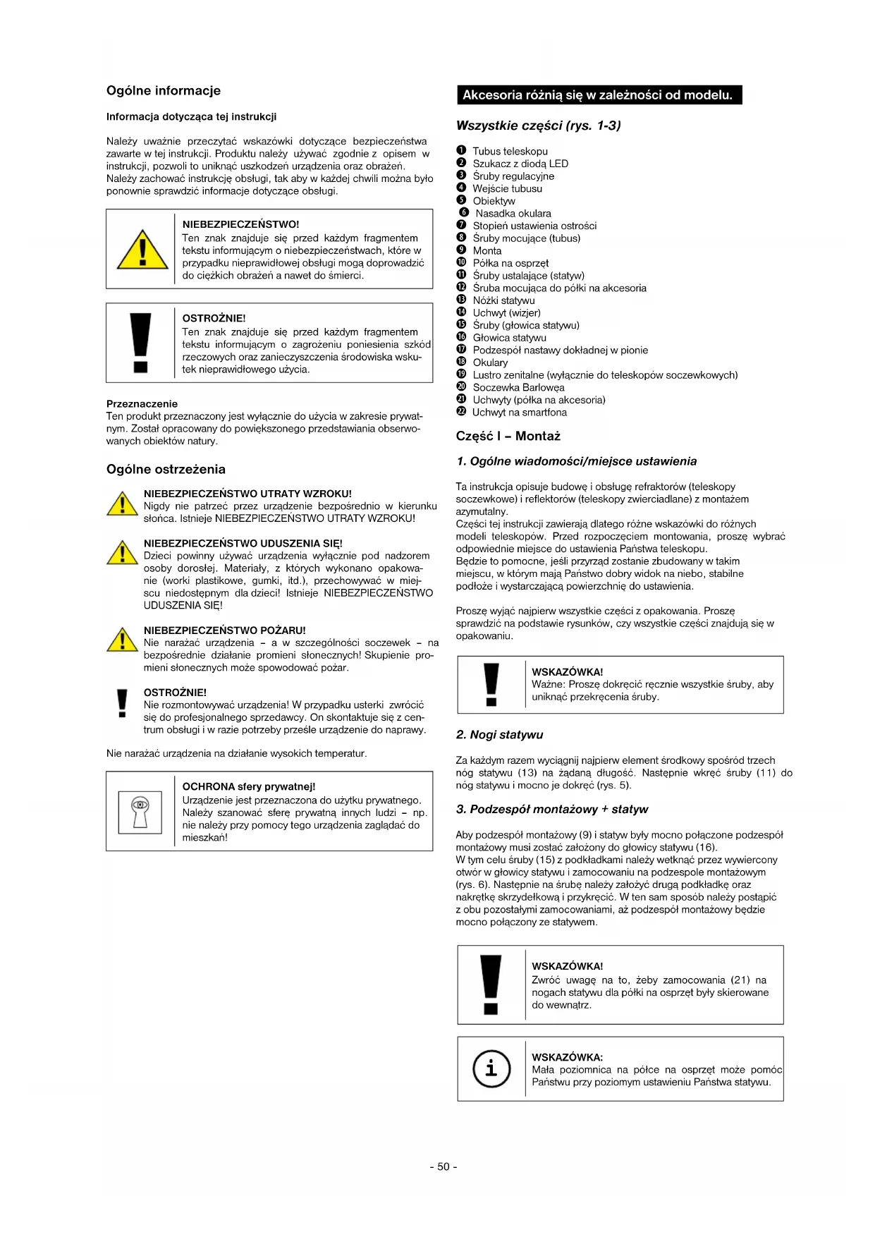 Ta instrukcja opisuje budowę i obsługę refraktorów (teleskopy soczewkowe) i reflektorów (teleskopy zwierciadlane) z montażem azymutalny. Części tej instrukcji zawierają dlatego różne wskazówki do różnych modeli teleskopów. Przed rozpoczęciem montowania, proszę wybrać odpowiednie miejsce do ustawienia Państwa teleskopu. Będzie to pomocne, jeśli przyrząd zostanie zbudowany w takim miejscu, w którym mają Państwo dobry widok na niebo, stabilne podłoże i wystarczającą powierzchnię do ustawienia. Proszę wyjąć najpierw wszystkie części z opakowania. Proszę sprawdzić na podstawie rysunków, czy wszystkie części znajdują się w opakowaniu. WSKAZÓWKA! Ważne: Proszę dokręcić ręcznie wszystkie śruby, aby uniknąć przekręcenia śruby.