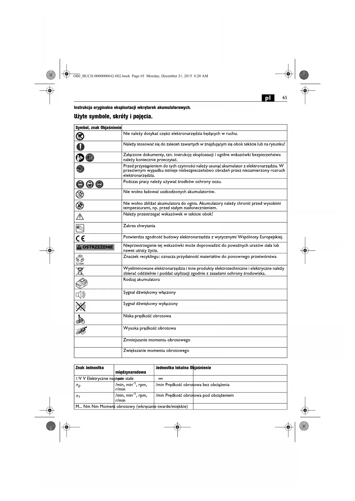 Instrukcja oryginalna eksploatacji wkrętarek akumulatorowych. Użyte symbole, skróty i pojęcia. Symbol, znak Objaśnienie Nie należy dotykać części elektronarzędzia będących w ruchu. Należy stosować się do zaleceń zawartych w znajdującym się obok tekście lub na rysunku! Załączone dokumenty, tzn. instrukcję eksploatacji i ogólne wskazówki bezpieczeństwa należy koniecznie przeczytać. Przed przystąpieniem do tych czynności należy usunąć akumulator z elektronarzędzia. W przeciwnym wypadku istnieje niebezpieczeństwo obrażeń przez niezamierzony rozruch elektronarzędzia. Podczas pracy należy używać środków ochrony oczu. Nie wolno ładować uszkodzonych akumulatorów. Nie wolno zbliżać akumulatora do ognia. Akumulatory należy chronić przed wysokimi temperaturami, np. przed stałym nasłonecznieniem. Należy przestrzegać wskazówek w tekście obok! Zakres chwytania Potwierdza zgodność budowy elektronarzędzia z wytycznymi Wspólnoty Europejskiej. Nieprzestrzeganie tej wskazówki może doprowadzić do poważnych urazów ciała lub nawet utraty życia. Znaczek recyklingu: oznacza przydatność materiałów do ponownego przetwórstwa Wyeliminowane elektronarzędzia i inne produkty elektrotechniczne i elektryczne należy zbierać oddzielnie i poddać utylizacji zgodnie z zasadami ochrony środowiska. Rodzaj akumulatora Sygnał dźwiękowy włączony Sygnał dźwiękowy wyłączony Niska prędkość obrotowa Wysoka prędkość obrotowa Zmniejszanie momentu obrotowego Zwiększanie momentu obrotowego Znak Jednostka międzynarodowa Jednostka lokalna Objaśnienie U V V Elektryczne napięcie stałe