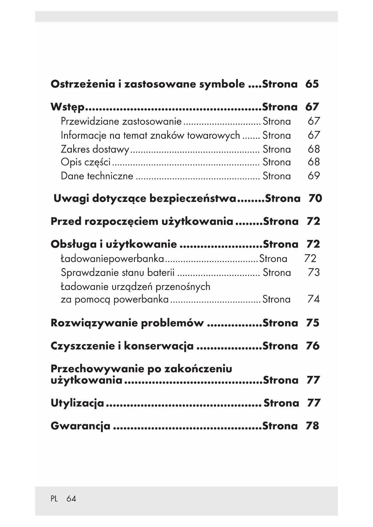 P Schoonmaken en verzorging Dit product bevat geen interne onderdelen die onderhoud behoeven. Vocht dat het product binnenkomt, kan leiden tot schade. Zorg ervoor dat er geen vocht het product binnenkomt tijdens reiniging om permanente beschadiging van het product te voorkomen. Gebruik geen schurende, op oplosmiddel gebaseerde of agressieve reinigingsmiddelen. Deze kunnen het oppervlak van het product beschadigen. Reinig het product alleen met een enigszins vochtige doek en milde wasvloeistof. P Opslag wanneer niet gebruikt Berg het product op een droge, stofvrije locatie op, beschermd tegen direct zonlicht. Als het product lange tijd niet wordt gebruikt, moet de ingebouwde batterij volledig worden opgeladen om de nuttige levensduur te verlengen. Laad de ingebouwde batterij regelmatig op als u het product een lange tijdsperiode niet gebruikt. Dit is nodig voor het behouden van de batterij.NL/BE 62 P Afvoer Verpakking: De verpakking bestaat uit milieuvriendelijke grondstoffen die u via de plaatselijke recyclingcontainers kunt afvoeren. Product: Uw gemeentelijke overheid verstrekt informatie over de mogelijkheden om het uitgediende product af te voeren. Het hiernaast afgebeelde symbool van een doorgestreepte vuilniscontainer op wieltjes geeft aan dat dit apparaat voldoet aan de richtlijn 2012/19/EG. Deze richtlijn houdt in dat u dit apparaat aan het einde van de gebruiksduur niet via het normale huisvuil mag afvoeren, maar dat u het op een speciaal hiervoor ingericht inzamelpunt, bij een milieupark of afvalverwerkend bedrijf af moet geven. Deze afvoer is voor u gratis. Ontzie het milieu en voer producten op een correcte manier af. Het product kan worden gerecycled, is onderhevig aan een uitgebreide fabrikant-verantwoordelijkheid en wordt afzonderlijk ingezameld. De ingebouwde accu kan niet voor afvoer uitgebouwd worden. Geef het product compleet aan een inzamelpunt voor oude elektronica af.NL/BE 63 P Garantie Het product wordt volgens strenge kwaliteitsrichtlijnen zorgvuldig geproduceerd en voor levering grondig getest. In geval van schade aan het product kunt u rechtmatig beroep doen op de verkoper van het product. Deze wettelijke rechten worden door onze hierna vermelde garantie niet beperkt. Op dit product verlenen wij 3 jaar garantie vanaf aankoopdatum. De garantieperiode start op de dag van aankoop. Bewaar de originele kassabon alstublieft. Dit document is nodig als bewijs voor aankoop. Wanneer binnen 3 jaar na de aankoopdatum van dit product een materiaal- of productiefout optreedt, dan wordt het product door ons – naar onze keuze – gratis voor u gerepareerd of vervangen. Deze garantie komt te vervallen als het product beschadigd wordt, niet correct gebruikt of onderhouden wordt. De garantie geldt voor materiaal- en productiefouten. Deze garantie is niet van toepassing op productonderdelen, die onderhevig zijn aan normale slijtage en hierdoor als aan slijtage onderhevige onderdelen gelden (bijv. batterijen) of voor beschadigingen aan breekbare onderdelen, zoals bijv. schakelaars, accu’s of dergelijke onderdelen, die gemaakt zijn van glas.PL 64 Ostrzeżenia i zastosowane symbole ....Strona 65 Wstęp ...................................................Strona 67 Przewidziane zastosowanie .............................. Strona 67 Informacje na temat znaków towarowych ....... Strona 67 Zakres dostawy .................................................. Strona 68 Opis części ......................................................... Strona 68 Dane techniczne ................................................ Strona 69 Uwagi dotyczące bezpieczeństwa ........Strona 70 Przed rozpoczęciem użytkowania ........Strona 72 Obsługa i użytkowanie ........................Strona 72 Ładowanie powerbanka .................................... Strona 72 Sprawdzanie stanu baterii ................................ Strona 73 Ładowanie urządzeń przenośnych za pomocą powerbanka ................................... Strona 74 Rozwiązywanie problemów ................Strona 75 Czyszczenie i konserwacja ...................Strona 76 Przechowywanie po zakończeniu użytkowania ........................................Strona 77 Utylizacja ............................................. Strona 77 Gwarancja ...........................................Strona 78PL 65 Ostrzeżenia i zastosowane symbole ....Strona 65 Wstęp ...................................................Strona 67 Przewidziane zastosowanie .............................. Strona 67 Informacje na temat znaków towarowych ....... Strona 67 Zakres dostawy .................................................. Strona 68 Opis części ......................................................... Strona 68 Dane techniczne ................................................ Strona 69 Uwagi dotyczące bezpieczeństwa ........Strona 70 Przed rozpoczęciem użytkowania ........Strona 72 Obsługa i użytkowanie ........................Strona 72 Ładowanie powerbanka .................................... Strona 72 Sprawdzanie stanu baterii ................................ Strona 73 Ładowanie urządzeń przenośnych za pomocą powerbanka ................................... Strona 74 Rozwiązywanie problemów ................Strona 75 Czyszczenie i konserwacja ...................Strona 76 Przechowywanie po zakończeniu użytkowania ........................................Strona 77 Utylizacja ............................................. Strona 77 Gwarancja ...........................................Strona 78 Ostrzeżenia i zastosowane symbole Poniższe ostrzeżenia i symbole występują w niniejszej instrukcji obsługi i na urządzeniu: ZAGROŻENIE! Ten symbol ze słowem „ZAGROŻENIE” oznacza wysokie ryzyko niebezpieczeństwa, które w razie wystąpienia będzie skutkować poważnymi obrażeniami lub śmiercią. OSTRZEŻENIE! Ten symbol ze słowem „OSTRZEŻENIE” oznacza średnie ryzyko niebezpieczeństwa, które w razie wystąpienia może skutkować poważnymi obra