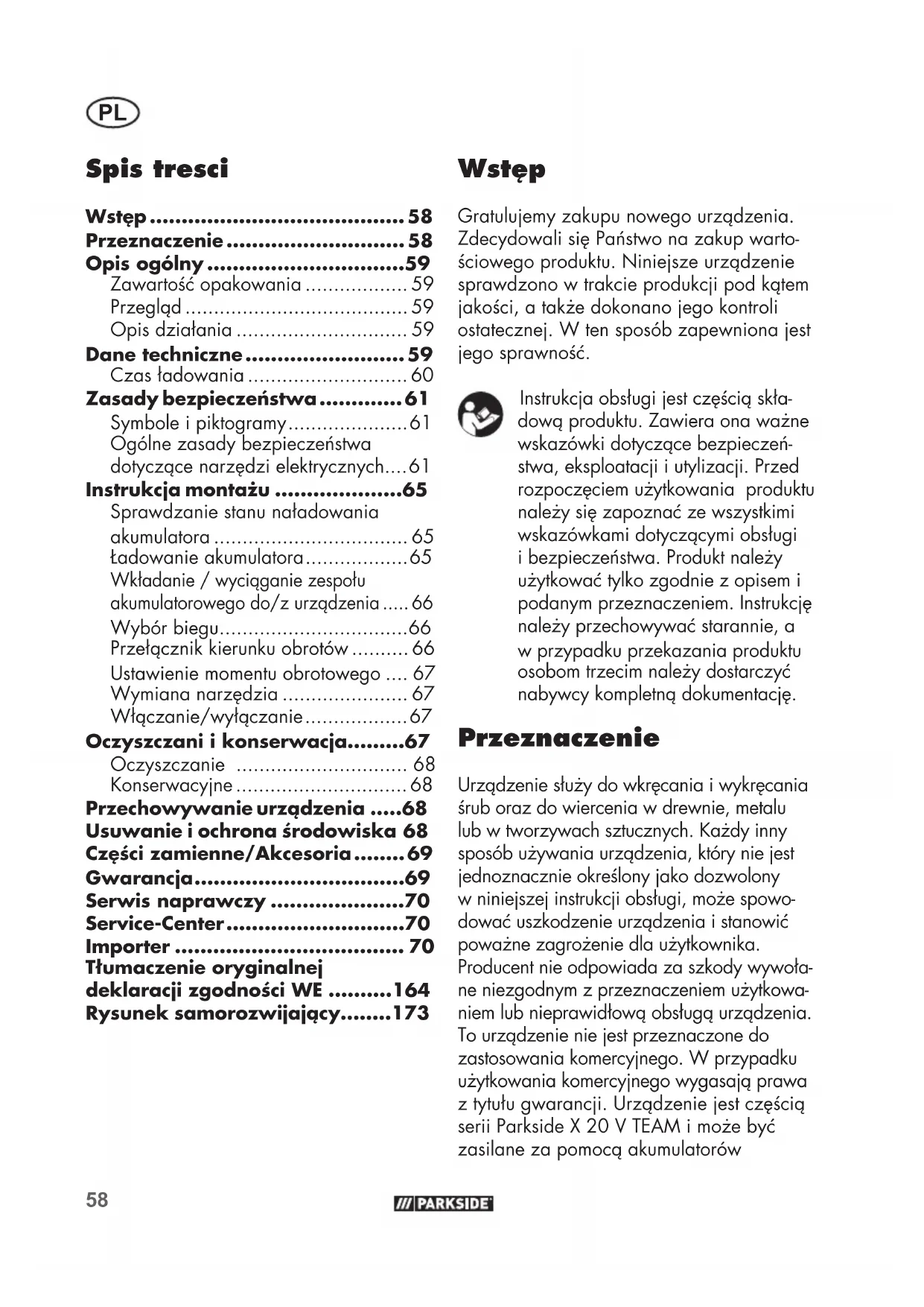 - Wstęp Gratulujemyzakupunowegourządzenia. ZdecydowalisięPaństwonazakupwarto- ściowegoproduktu.Niniejszeurządzenie sprawdzonowtrakcieprodukcjipodkątem jakości,atakżedokonanojegokontroli ostatecznej.Wtensposóbzapewnionajest jegosprawność. Instrukcjaobsługijestczęściąskła- dowąproduktu.Zawieraonaważne wskazówkidotyczącebezpieczeń- stwa,eksploatacjiiutylizacji.Przed rozpoczęciemużytkowaniaproduktu należysięzapoznaćzewszystkimi wskazówkamidotyczącymiobsługi ibezpieczeństwa.Produktnależy użytkowaćtylkozgodniezopisemi podanymprzeznaczeniem.Instrukcję należyprzechowywaćstarannie,a w przypadku przekazania produktu osobomtrzecimnależydostarczyć nabywcykompletnądokumentację. Przeznaczenie Urządzeniesłużydowkręcaniaiwykręcania śruborazdowierceniawdrewnie,metalu lubwtworzywachsztucznych.Każdyinny sposóbużywaniaurządzenia,któryniejest jednoznacznieokreślonyjakodozwolony wniniejszejinstrukcjiobsługi,możespowo- dowaćuszkodzenieurządzeniaistanowić poważnezagrożeniedlaużytkownika. Producentnieodpowiadazaszkodywywoła- neniezgodnymzprzeznaczeniemużytkowa- niemlubnieprawidłowąobsługąurządzenia. Tourządzenieniejestprzeznaczonedo zastosowaniakomercyjnego.Wprzypadku użytkowaniakomercyjnegowygasająprawa ztytuługwarancji.Urządzeniejestczęścią seriiParksideX20VTEAMimożebyć zasilanezapomocąakumulatorów Tłumaczenie oryginalnej deklaracji zgodności WE p. 164