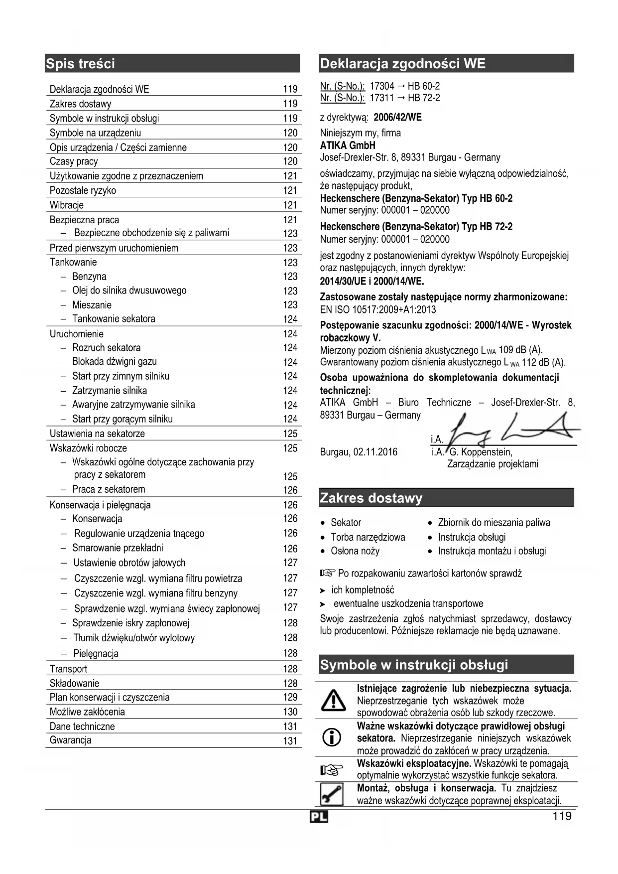 112 dB (A). Osoba upoważniona do skompletowania dokumentacji technicznej: ATIKA GmbH – Biuro Techniczne – Josef-Drexler-Str. 8, 89331 Burgau – Germany i.A. Burgau, 02.11.2016 i.A. G. Koppenstein, Zarządzanie projektami