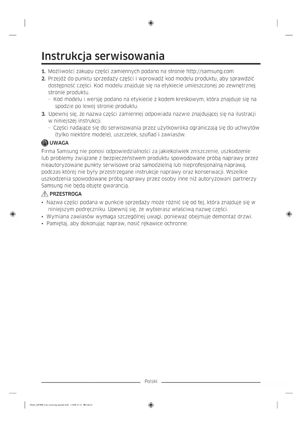 w niniejszej instrukcji. - Części nadające się do serwisowania przez użytkownika ograniczają się do uchwytów (tylko niektóre modele), uszczelek, szuad i zawiasów. UWAGA Firma Samsung nie ponosi odpowiedzialności za jakiekolwiek zniszczenie, uszkodzenie lub problemy związane z bezpieczeństwem produktu spowodowane próbą naprawy przez nieautoryzowane punkty serwisowe oraz samodzielną lub nieprofesjonalną naprawą, podczas której nie były przestrzegane instrukcje naprawy oraz konserwacji. Wszelkie uszkodzenia spowodowane próbą naprawy przez osoby inne niż autoryzowani partnerzy Samsung nie będą objęte gwarancją. PRZESTROGA