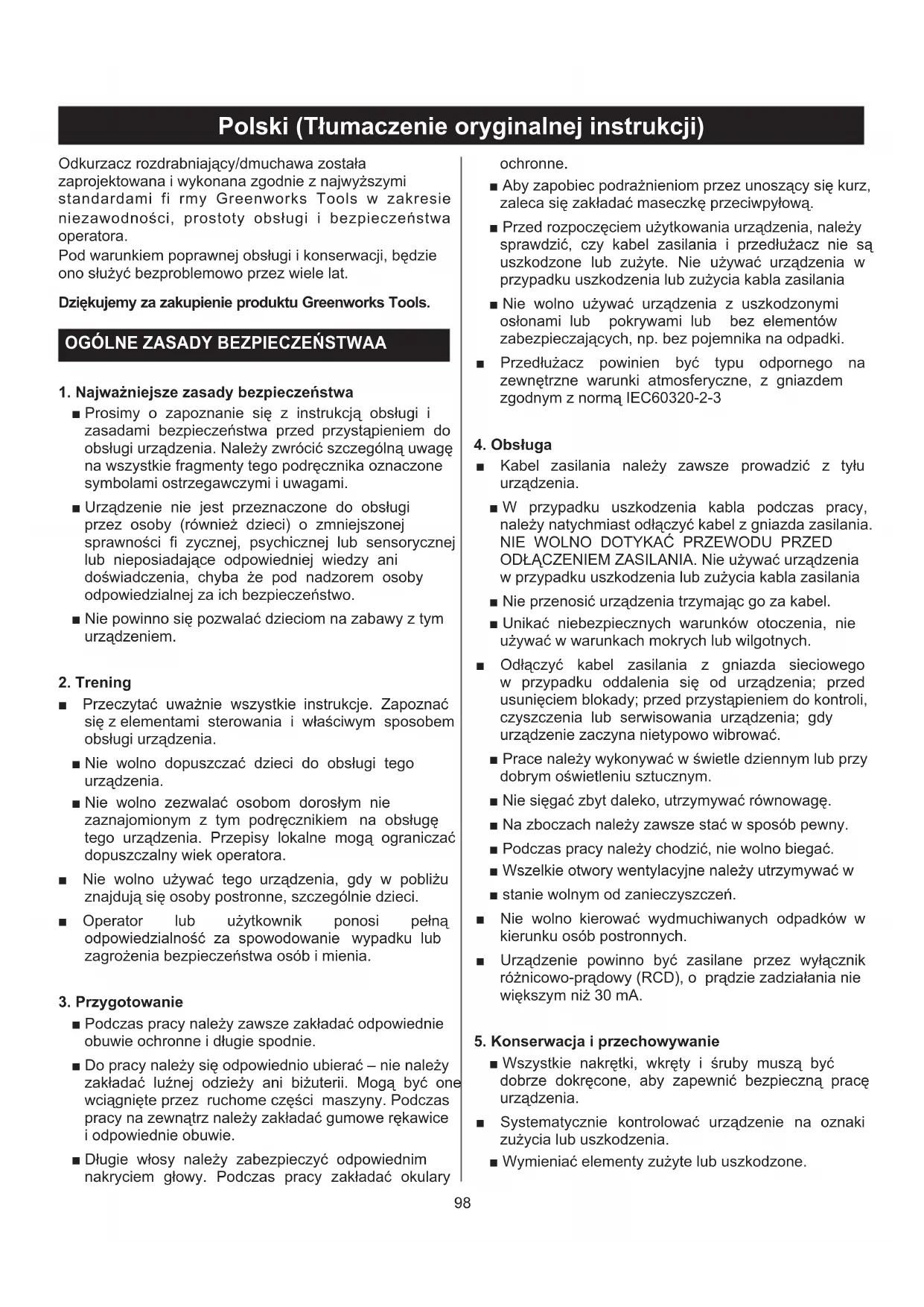 Polski (Tłumaczenie oryginalnej instrukcji) ROZPAKOWANIE ZESPOŁU ■ Wyjmij ostrożnie produkt i akcesoria z opakowania. ■ Sprawdź dokładnie, czy produkt nie został uszkodzony podczas transportu. ■ Nie wyrzucać opakowania aż do czasu dokładnego sprawdzenia i pomyślnego uruchomienia ■ produktu. ■ Jeśli jakiekolwiek części są uszkodzone lub brakuje części, należy skontaktować się z centrum serwisowym Greenworks Tools, aby uzyskać pomoc. Dmuchawa jest dostarczana z niektórymi elementami, które nie są zmontowane. Aby je zmontować, należy wykonać następujące czynności: MONTAŻ MULCZARKI (rys.2) ■ Zsuń razem przednie i tylne rury mulczarki aż zostaną zablokowane. (patrz rys. 2) ■ Przesuń przycisk blokady do przodu, aby zwolnić bramę. Pozostaw bramę otwartą. (patrz rys. 2.1) ■ Włóż „zaklinowaną” spinkę końcową rury mulczarki do tylnej spinki. (patrz rys. 2.2). Przesuń „zakrzywioną” spinkę końcową rury mulczarki do przedniej spinki. (patrz rys. 2.3). Przesuń przycisk blokady do tyłu, aby włączyć rurkę mulczarki. (patrz rys. 2.4) ■ Aby usunąć rurki mulczarki, wykonaj czynności (3) (2) (1). ■ Włóż adapter worka do otworu dmuchawy. Zablokuj adapter worka za pomocą przycisku blokady. Aby wyjąć worek, po prostu naciśnij przycisk blokady i wyjmij worek (patrz rys. 4). UWAGA: Może być konieczne usunięcie rury dmuchawy lub rur mulczarki w celu usunięcia zablokowanej rury lub wirnika. OSTRZEŻENIE: Aby uniknąć poważnych obrażeń ciała, przed mocowaniem lub demontażem rur należy upewnić się, że przełącznik znajduje się w położeniu Wył., jest odłączony i wirniki nie obracają się. MONTAŻ DMUCHAWY (rys. 3) ■ Przesuń rurę dmuchawy do przodu, aż karbowane obszary na obudowie dmuchawy zatrzasną się w rowkach rury. MONTAŻ WORKA Z UPRZĘŻĄ NA RAMIĘ (rys. 4) ■ Stojąc w pozycji roboczej, wyreguluj długość, aby dopasować rozmiar do operatora. Pociągnij wypust, aby wydłużyć lub pociągnij pasek, aby skrócić. OBSŁUGA PODŁĄCZENIE PRZEWODU ZASILAJĄCEGO (rys. 5) ■ Przymocuj przedłużacz do obudowy silnika, używając wycięcia z tyłu dmuchawy. Zapobiega to przypadkowemu odłączeniu przewodu elektrycznego. ■ Podłącz żeńską końcówkę przewodu elektrycznego do gniazda w tylnej części urządzenia.