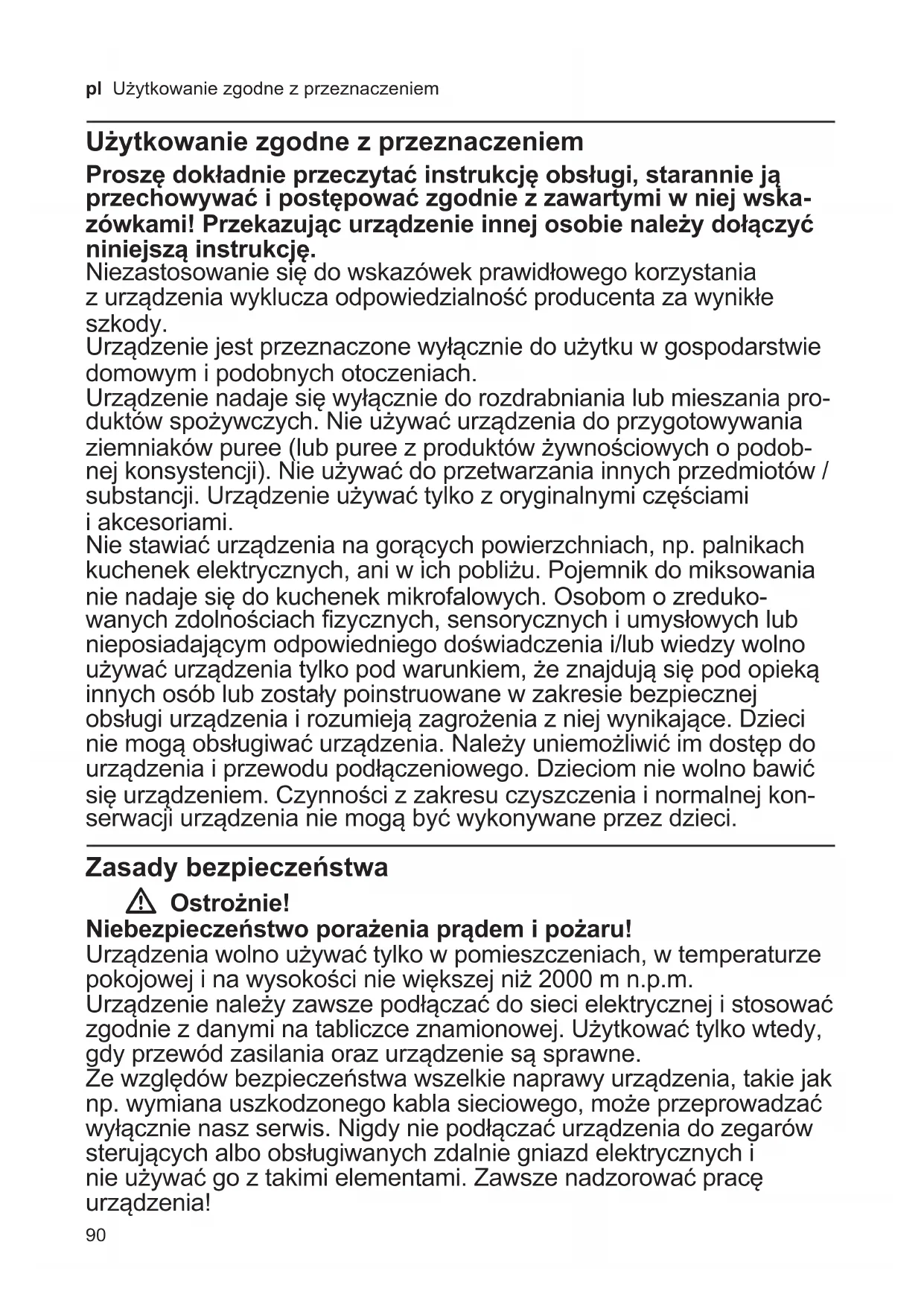 Cihazınızıkullanmayacaksanız, düğmesindenkapatıpkaldırınız. Değişiklikhaklarımahfuzdur.90 pl Użytkowaniezgodnezprzeznaczeniem Użytkowanie zgodne z przeznaczeniem Proszę dokładnie przeczytać instrukcję obsługi, starannie ją przechowywać i postępować zgodnie z zawartymi w niej wska- zówkami! Przekazując urządzenie innej osobie należy dołączyć niniejszą instrukcję. Niezastosowaniesiędowskazówekprawidłowegokorzystania zurządzeniawykluczaodpowiedzialnośćproducentazawynikłe szkody. Urządzeniejestprzeznaczonewyłączniedoużytkuwgospodarstwie domowym i podobnych otoczeniach. Urządzenienadajesięwyłączniedorozdrabnianialubmieszaniapro- duktówspożywczych.Nieużywaćurządzeniadoprzygotowywania ziemniakówpuree(lubpureezproduktówżywnościowychopodob- nejkonsystencji).Nieużywaćdoprzetwarzaniainnychprzedmiotów/ substancji.Urządzenieużywaćtylkozoryginalnymiczęściami i akcesoriami. Niestawiaćurządzenianagorącychpowierzchniach,np.palnikach kuchenekelektrycznych,aniwichpobliżu.Pojemnikdomiksowania nienadajesiędokuchenekmikrofalowych.Osobomozreduko- wanychzdolnościachfizycznych,sensorycznychiumysłowychlub nieposiadającymodpowiedniegodoświadczeniai/lubwiedzywolno używaćurządzeniatylkopodwarunkiem,żeznajdująsiępodopieką innychosóblubzostałypoinstruowanewzakresiebezpiecznej obsługiurządzeniairozumiejązagrożeniazniejwynikające.Dzieci niemogąobsługiwaćurządzenia.Należyuniemożliwićimdostępdo urządzeniaiprzewodupodłączeniowego.Dzieciomniewolnobawić sięurządzeniem.Czynnościzzakresuczyszczeniainormalnejkon- serwacjiurządzenianiemogąbyćwykonywaneprzezdzieci. Zasady bezpieczeństwa W Ostrożnie! Niebezpieczeństwo porażenia prądem i pożaru! Urządzeniawolnoużywaćtylkowpomieszczeniach,wtemperaturze pokojowejinawysokościniewiększejniż2000mn.p.m. Urządzenienależyzawszepodłączaćdosiecielektrycznejistosować zgodniezdanyminatabliczceznamionowej.Użytkowaćtylkowtedy, gdyprzewódzasilaniaorazurządzeniesąsprawne. Zewzględówbezpieczeństwawszelkienaprawyurządzenia,takiejak np.wymianauszkodzonegokablasieciowego,możeprzeprowadzać wyłącznienaszserwis.Nigdyniepodłączaćurządzeniadozegarów sterującychalboobsługiwanychzdalniegniazdelektrycznychi nieużywaćgoztakimielementami.Zawszenadzorowaćpracę urządzenia!91
