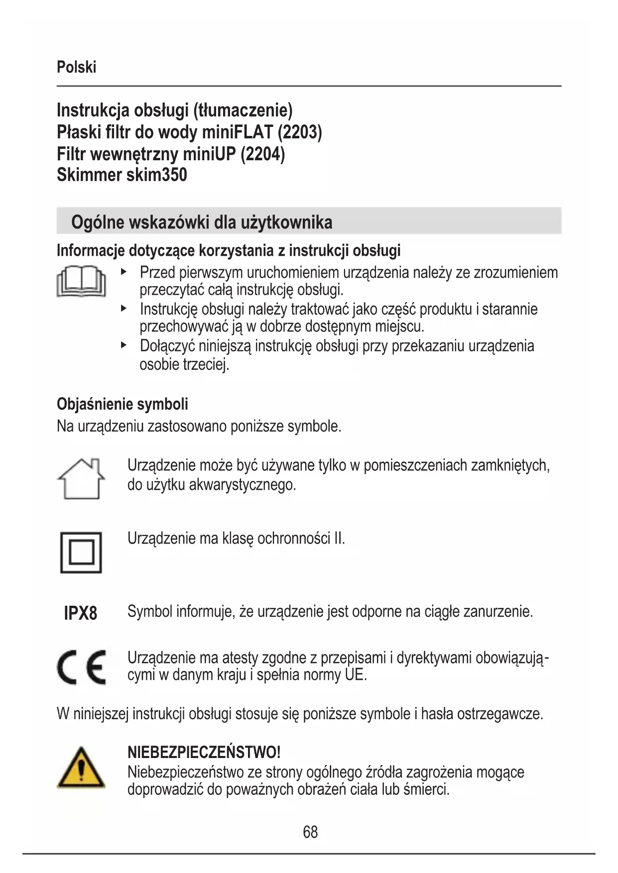 Instrukcja obsługi (tłumaczenie) Płaski ltr do wody miniFLAT (2203) Filtr wewnętrzny miniUP (2204) Skimmer skim350 Ogólne wskazówki dla użytkownika Informacje dotyczące korzystania z instrukcji obsługi ▶ Przed pierwszym uruchomieniem urządzenia należy ze zrozumieniem przeczytać całą instrukcję obsługi. ▶ Instrukcję obsługi należy traktować jako część produktu i starannie przechowywać ją w dobrze dostępnym miejscu. ▶ Dołączyć niniejszą instrukcję obsługi przy przekazaniu urządzenia osobie trzeciej. Objaśnienie symboli Na urządzeniu zastosowano poniższe symbole. Urządzenie może być używane tylko w pomieszczeniach zamkniętych, do użytku akwarystycznego. Urządzenie ma klasę ochronności II. Symbol informuje, że urządzenie jest odporne na ciągłe zanurzenie. Urządzenie ma atesty zgodne z przepisami i dyrektywami obowiązują