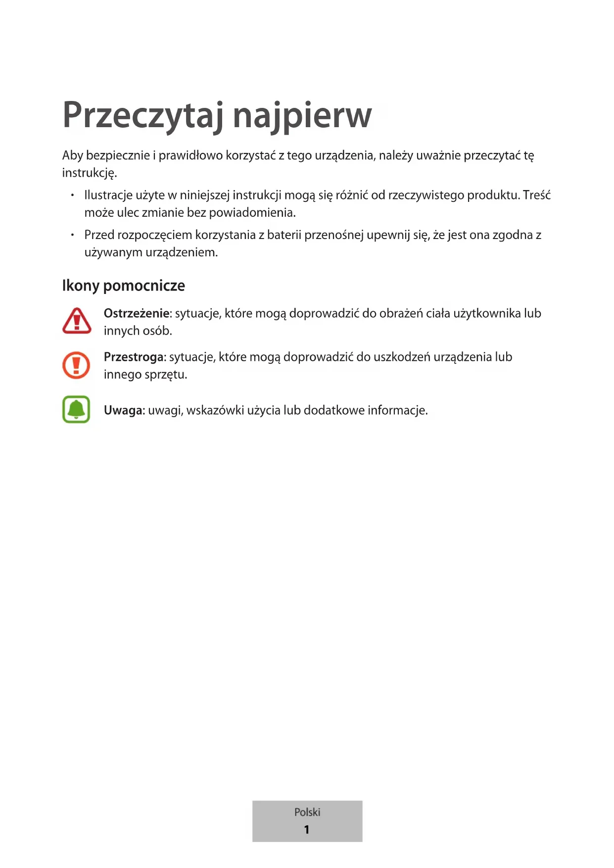 Przed rozpoczęciem korzystania z baterii przenośnej upewnij się, że jest ona zgodna z używanym urządzeniem. Ikony pomocnicze Ostrzeżenie: sytuacje, które mogą doprowadzić do obrażeń ciała użytkownika lub innych osób. Przestroga: sytuacje, które mogą doprowadzić do uszkodzeń urządzenia lub innego sprzętu. Uwaga: uwagi, wskazówki użycia lub dodatkowe informacje. Polski