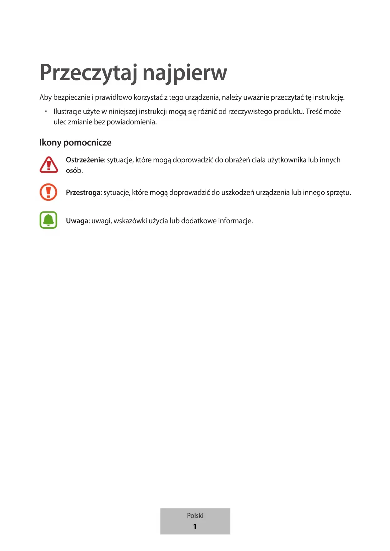 Ilustracje użyte w niniejszej instrukcji mogą się różnić od rzeczywistego produktu. Treść może ulec zmianie bez powiadomienia. Ikony pomocnicze Ostrzeżenie: sytuacje, które mogą doprowadzić do obrażeń ciała użytkownika lub innych osób. Przestroga: sytuacje, które mogą doprowadzić do uszkodzeń urządzenia lub innego sprzętu. Uwaga: uwagi, wskazówki użycia lub dodatkowe informacje. Polski