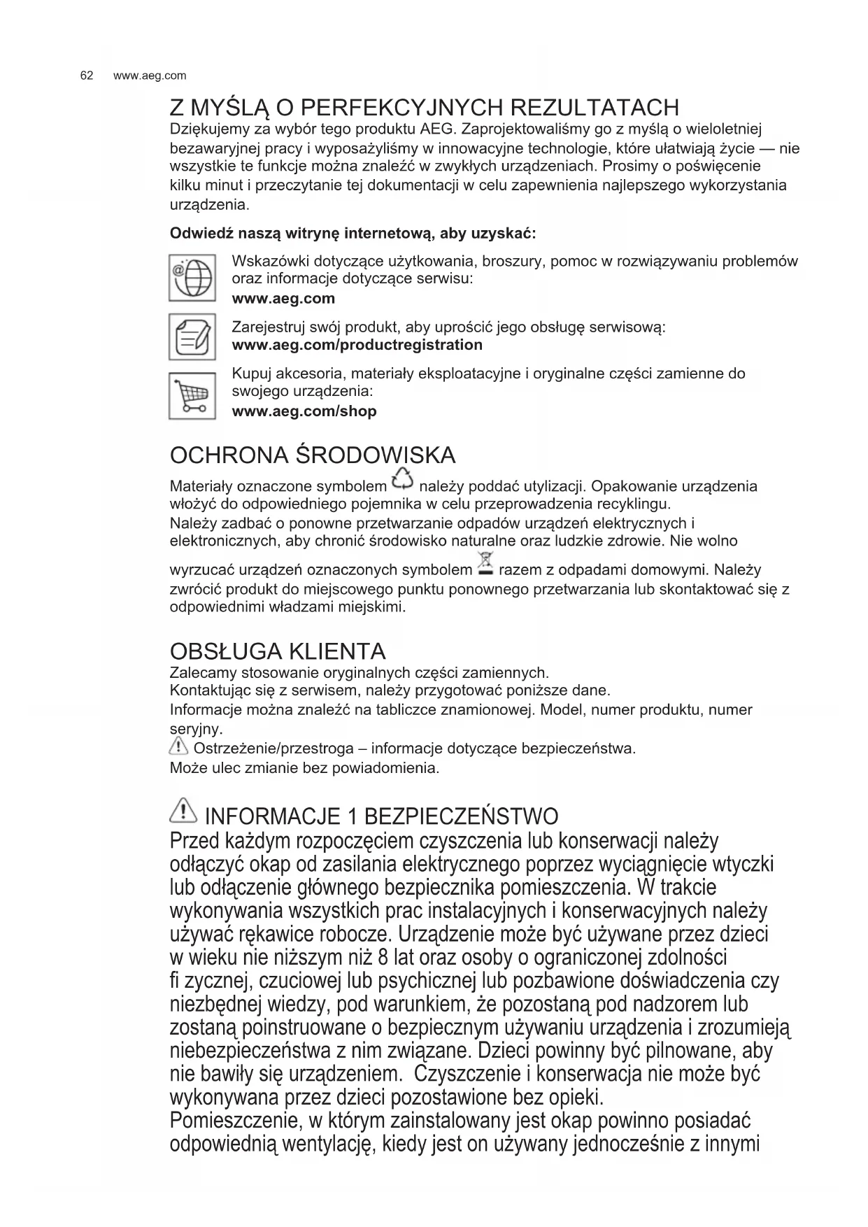 Dziękujemy za wybór tego produktu AEG. Zaprojektowaliśmy go z myślą o wieloletniej bezawaryjnej pracy i wyposażyliśmy w innowacyjne technologie, które ułatwiają życie — nie wszystkie te funkcje można znaleźć w zwykłych urządzeniach. Prosimy o poświęcenie kilku minut i przeczytanie tej dokumentacji w celu zapewnienia najlepszego wykorzystania urządzenia. Odwiedź naszą witrynę internetową, aby uzyskać: Wskazówki dotyczące użytkowania, broszury, pomoc w rozwiązywaniu problemów oraz informacje dotyczące serwisu: www.aeg.com Zarejestruj swój produkt, aby uprościć jego obsługę serwisową: www.aeg.com/productregistration Kupuj akcesoria, materiały eksploatacyjne i oryginalne części zamienne do swojego urządzenia: www.aeg.com/shop OCHRONA ŚRODOWISKA Materiały oznaczone symbolem należy poddać utylizacji. Opakowanie urządzenia włożyć do odpowiedniego pojemnika w celu przeprowadzenia recyklingu. Należy zadbać o ponowne przetwarzanie odpadów urządzeń elektrycznych i elektronicznych, aby chronić środowisko naturalne oraz ludzkie zdrowie. Nie wolno wyrzucać urządzeń oznaczonych symbolem razem z odpadami domowymi. Należy zwrócić produkt do miejscowego punktu ponownego przetwarzania lub skontaktować się z odpowiednimi władzami miejskimi.