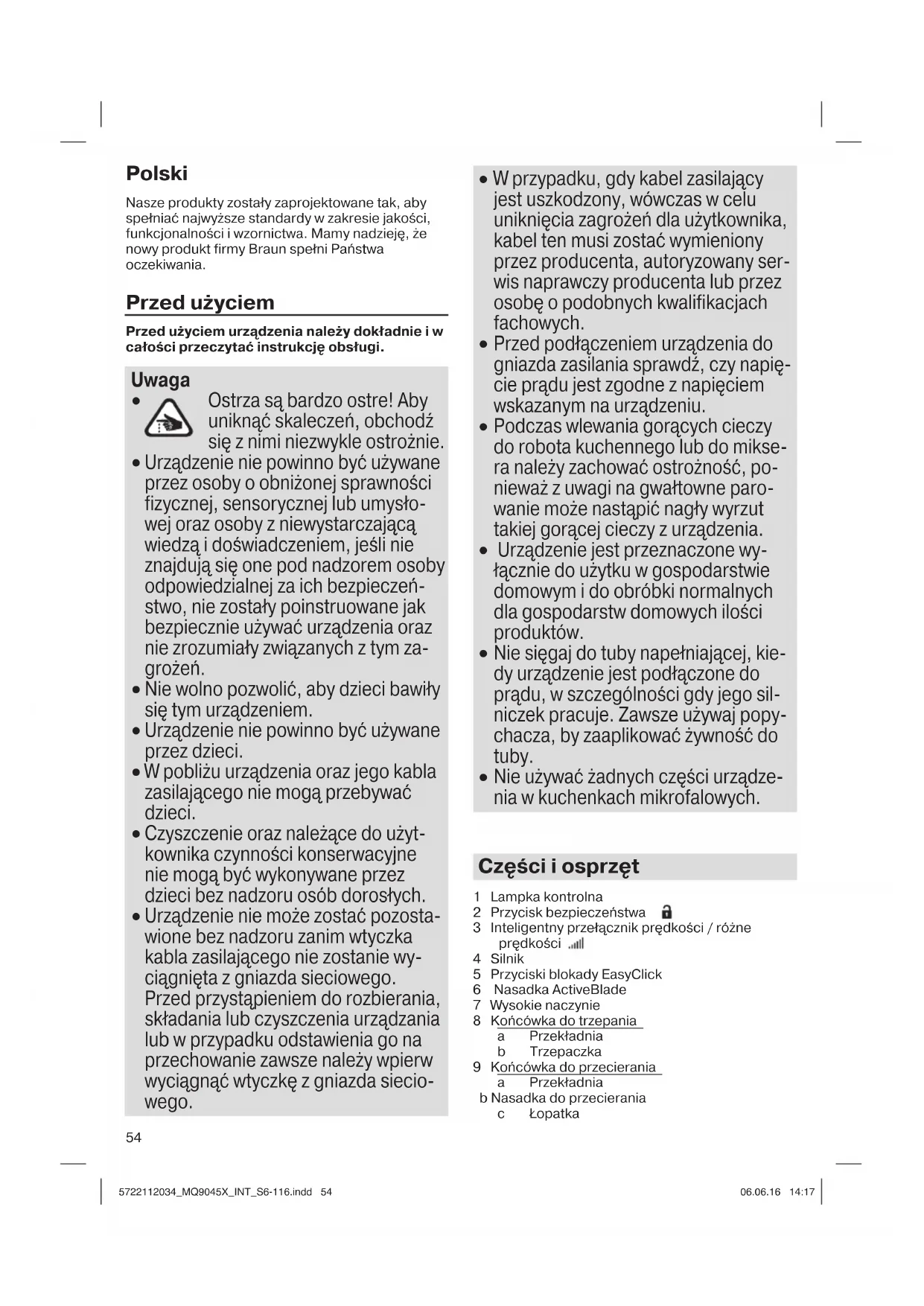 - Miksuj składniki poruszając delikatnie końcówką w górę i w dół, aż do uzyskania wymaganej konsystencji produktów. Wysokość położenia ostrza w nasadce miksującej ActiveBlade zmienia 5722112034_MQ9045X_INT_S6-116.indd 555722112034_MQ9045X_INT_S6-116.indd 55 06.06.16 14:1706.06.16 14:1756 się w zależności od przyłożonej siły nacisku.