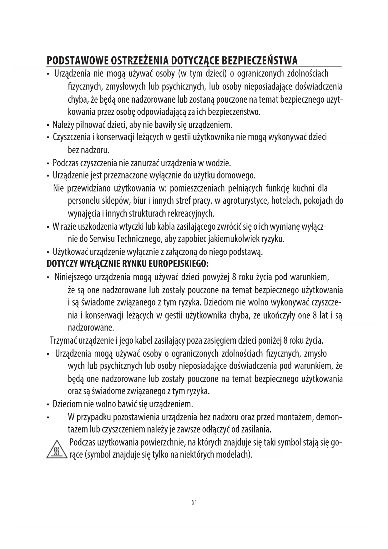 - Niniejszego urządzenia mogą używać dzieci powyżej 8 roku życia pod warunkiem, że są one nadzorowane lub zostały pouczone na temat bezpiecznego użytkowania i są świadome związanego z tym ryzyka. Dzieciom nie wolno wykonywać czyszcze- nia i konserwacji leżących w gestii użytkownika chyba, że ukończyły one 8 lat i są nadzorowane. Trzymać urządzenie i jego kabel zasilający poza zasięgiem dzieci poniżej 8 roku życia.