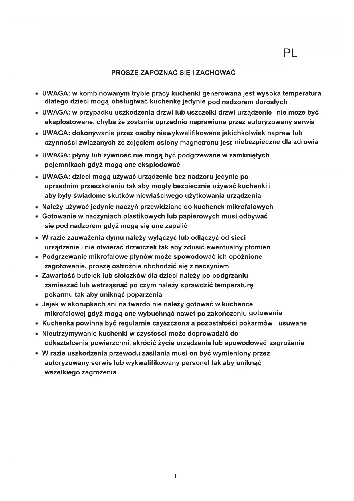 UWAGA: w kombinowanym trybie pracy kuchenki generowana jest wysoka temperatura dlatego dzieci mogą obsługiwać kuchenkę jedynie pod nadzorem dorosłych UWAGA: w przypadku uszkodzenia drzwi lub uszczelki drzwi urządzenie nie może być eksploatowane, chyba że zostanie uprzednio naprawione przez autoryzowany serwis UWAGA: dokonywanie przez osoby niewykwalifikowane jakichkolwiek napraw lub czynności związanych ze zdjęciem osłony magnetronu jest niebezpieczne dla zdrowia UWAGA: płyny lub żywność nie mogą być podgrzewane w zamkniętych pojemnikach gdyż mogą one eksplodować UWAGA: dzieci mogą używać urządzenie bez nadzoru jedynie po uprzednim przeszkoleniu tak aby mogły bezpiecznie używać kuchenki i aby były świadome skutków niewłaściwego użytkowania urządzenia Należy używać jedynie naczyń przewidziane do kuchenek mikrofalowych Gotowanie w naczyniach plastikowych lub papierowych musi odbywać się pod nadzorem gdyż mogą się one zapalić W razie zauważenia dymu należy wyłączyć lub odłączyć od sieci urządzenie i nie otwierać drzwiczek tak aby zdusić ewentualny płomień Podgrzewanie mikrofalowe płynów może spowodować ich opóźnione zagotowanie, proszę ostrożnie obchodzić się z naczyniem Zawartość butelek lub słoiczków dla dzieci należy po podgrzaniu zamieszać lub wstrząsnąć po czym należy sprawdzić temperaturę pokarmu tak aby uniknąć poparzenia Jajek w skorupkach ani na twardo nie należy gotować w kuchence mikrofalowej gdyż mogą one wybuchnąć nawet po zakończeniu gotowania Kuchenka powinna być regularnie czyszczona a pozostałości pokarmów usuwane Nieutrzymywanie kuchenki w czystości może doprowadzić do odkształcenia powierzchni, skrócić życie urządzenia lub spowodować zagrożenie W razie uszkodzenia przewodu zasilania musi on być wymieniony przez autoryzowany serwis lub wykwalifikowany personel tak aby uniknąć wszelkiego zagrożenia