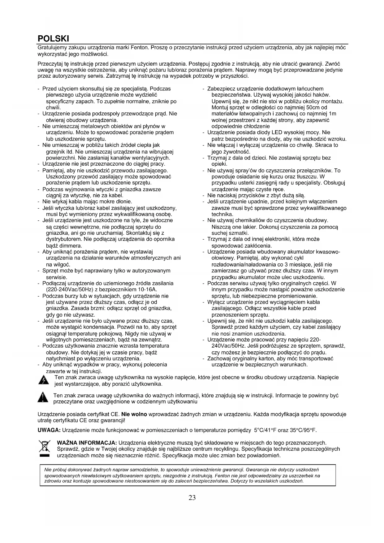Belgium (BE), Denmark (DK), France (F), Finland (FI), Germany (DE), Hungary (HU), Italy (IT), Netherlands (NL), Norway (NO), Poland (PL), Portugal (PT), Romania (RO), Slovenia (SI), Spain (ES), Sweden (SE), Switzerland (CH), Great Britain (GB).23 POLSKI Gratulujemy zakupu urządzenia marki Fenton. Proszę o przeczytanie instrukcji przed użyciem urządzenia, aby jak najlepiej móc wykorzystać jego możliwości. Przeczytaj tę instrukcję przed pierwszym użyciem urządzenia. Postępuj zgodnie z instrukcją, aby nie utracić gwarancji. Zwróć uwagę na wszystkie ostrzeżenia, aby uniknąć pożaru lub/oraz porażenia prądem. Naprawy mogą być przeprowadzane jedynie przez autoryzowany serwis. Zatrzymaj tę instrukcję na wypadek potrzeby w przyszłości. - Przed użyciem skonsultuj się ze specjalistą. Podczas pierwszego użycia urządzenie może wydzielić specyficzny zapach. To zupełnie normalne, zniknie po chwili. - Urządzenie posiada podzespoły przewodzące prąd. Nie otwieraj obudowy urządzenia. - Nie umieszczaj metalowych obiektów ani płynów w urządzeniu. Może to spowodować porażenie prądem lub uszkodzenie sprzętu. - Nie umieszczaj w pobliżu takich źródeł ciepła jak grzejnik itd. Nie umieszczaj urządzenia na wibrującej powierzchni. Nie zasłaniaj kanałów wentylacyjnych. - Urządzenie nie jest przeznaczone do ciągłej pracy. - Pamiętaj, aby nie uszkodzić przewodu zasilającego. Uszkodzony przewód zasilający może spowodować porażenie prądem lub uszkodzenie sprzętu. - Podczas wyjmowania wtyczki z gniazdka zawsze ciągnij za wtyczkę, nie za kabel. - Nie wtykaj kabla mając mokre dłonie. - Jeśli wtyczka lub/oraz kabel zasilający jest uszkodzony, musi być wymieniony przez wykwalifikowaną osobę. - Jeśli urządzenie jest uszkodzone na tyle, że widoczne są części wewnętrzne, nie podłączaj sprzętu do gniazdka, ani go nie uruchamiaj. Skontaktuj się z dystrybutorem. Nie podłączaj urządzenia do opornika bądź dimmera. - Aby uniknąć porażenia prądem, nie wystawiaj urządzenia na działanie warunków atmosferycznych ani na wilgoć. - Sprzęt może być naprawiany tylko w autoryzowanym serwisie. - Podłączaj urządzenie do uziemionego źródła zasilania (220-240Vac/50Hz) z bezpiecznikiem 10-16A. - Podczas burzy lub w sytuacjach, gdy urządzenie nie jest używane przez dłuższy czas, odłącz je od gniazdka. Zasada brzmi: odłącz sprzęt od gniazdka, gdy go nie używasz. - Jeśli urządzenie nie było używane przez dłuższy czas, może wystąpić kondensacja. Pozwól na to, aby sprzęt osiągnął temperaturę pokojową. Nigdy nie używaj w wilgotnych pomieszczeniach, bądź na zewnątrz. - Podczas użytkowania znacznie wzrasta temperatura obudowy. Nie dotykaj jej w czasie pracy, bądź natychmiast po wyłączeniu urządzenia. - Aby uniknąć wypadków w pracy, wykonuj polecenia zawarte w tej instrukcji. - Zabezpiecz urządzenie dodatkowym łańcuchem bezpieczeństwa. Używaj wysokiej jakości haków. Upewnij się, że nikt nie stoi w pobliżu okolicy montażu. Montuj sprzęt w odległości co najmniej 50cm od materiałów łatwopalnych i zachowuj co najmniej 1m wolnej przestrzeni z każdej strony, aby zapewnić odpowiednie chłodzenie - Urządzenie posiada diody LED wysokiej mocy. Nie patrz bezpośrednio na diody, aby nie uszkodzić wzroku. - Nie włączaj i wyłączaj urządzenia co chwilę. Skraca to jego żywotność. - Trzymaj z dala od dzieci. Nie zostawiaj sprzętu bez opieki. - Nie używaj spray’ów do czyszczenia przełączników. To powoduje osiadanie się kurzu oraz tłuszczu. W przypadku usterki zasięgnij rady u specjalisty. Obsługuj urządzenie mając czyste ręce. - Nie naciskaj przycisków z zbyt dużą siłą. - Jeśli urządzenie upadnie, przed kolejnym włączeniem zawsze musi być sprawdzone przez wykwalifikowanego technika. - Nie używaj chemikaliów do czyszczenia obudowy. Niszczą one lakier. Dokonuj czyszczenia za pomocą suchej szmatki. - Trzymaj z dala od innej elektroniki, która może spowodować zakłócenia. - Urządzenie posiada wbudowany akumulator kwasowo- ołowiowy. Pamiętaj, aby wykonać cykl rozładowania/naładowania co 3 miesiące, jeśli nie zamierzasz go używać przez dłuższy czas. W innym przypadku akumulator może ulec uszkodzeniu. - Podczas serwisu używaj tylko oryginalnych części. W innym przypadku może nastąpić poważne uszkodzenie sprzętu, lub niebezpieczne promieniowanie. - Wyłącz urządzenie przed wyciągnięciem kabla zasilającego. Odłącz wszystkie kable przed przenoszeniem sprzętu. - Upewnij się, że nikt nie uszkodzi kabla zasilającego. Sprawdź przed każdym użyciem, czy kabel zasilający nie nosi znamion uszkodzenia. - Urządzenie może pracować przy napięciu 220- 240Vac/50Hz. Jeśli podróżujesz ze sprzętem, sprawdź, czy możesz je bezpiecznie podłączyć do prądu. - Zachowaj oryginalny karton, aby móc transportować urządzenie w bezpiecznych warunkach. Ten znak zwraca uwagę użytkownika na wysokie napięcie, które jest obecne w środku obudowy urządzenia. Napięcie jest wystarczające, aby porazić użytkownika. Ten znak zwraca uwagę użytkownika do ważnych informacji, które znajdują się w instrukcji. Informacje te powinny być przeczytane oraz uwzględnione w codziennym użytkowaniu Urządzenie posiada certyfikat CE. Nie wolno wprowadzać żadnych zmian w urządzeniu. Każda modyfikacja sprzętu spowoduje utratę certyfikatu CE oraz gwarancji! UWAGA: Urządzenie może funkcjonować w pomieszczeniach o temperaturze pomiędzy 5°C/41°F oraz 35°C/95°F. WAŻNA INFORMACJA: Urządzenia elektryczne muszą być składowane w miejscach do tego przeznaczonych. Sprawdź, gdzie w Twojej okolicy znajduje się najbliższe centrum recyklingu. Specyfikacja techniczna poszczególnych urządzeniach może się nieznacznie różnić. Specyfikacja może ulec zmian bez powiadomień. Nie próbuj dokonywać żadnych napraw samodzielnie, to spowoduje unieważni
