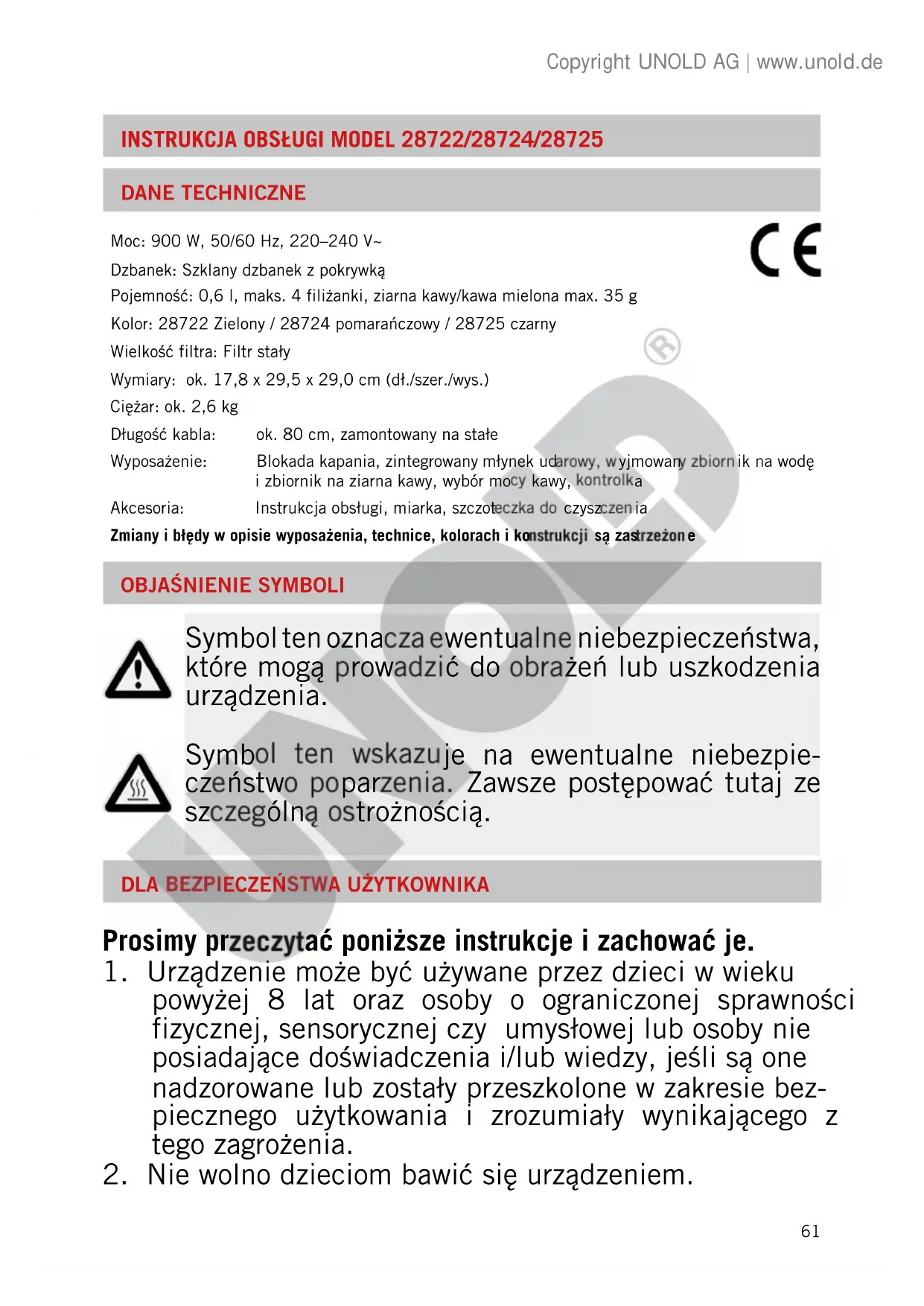 Moc: 900 W, 50/60 Hz, 220–240 V~ Dzbanek: Szklany dzbanek z pokrywką Pojemność: 0,6 l, maks. 4 filiżanki, ziarna kawy/kawa mielona max. 35 g Kolor: 28722 Zielony / 28724 pomarańczowy / 28725 czarny Wielkość filtra: Filtr stały Wymiary: ok. 17,8 x 29,5 x 29,0 cm (dł./szer./wys.) Ciężar: ok. 2,6 kg Długość kabla: ok. 80 cm, zamontowany na stałe Wyposażenie: Blokada kapania, zintegrowany młynek udarowy, wyjmowany zbiornik na wodę i zbiornik na ziarna kawy, wybór mocy kawy, kontrolka Akcesoria: Instrukcja obsługi, miarka, szczoteczka do czyszczenia Zmiany i błędy w opisie wyposażenia, technice, kolorach i konstrukcji są zastrzeżone Copyright UNOLD AG | www.unold.de62