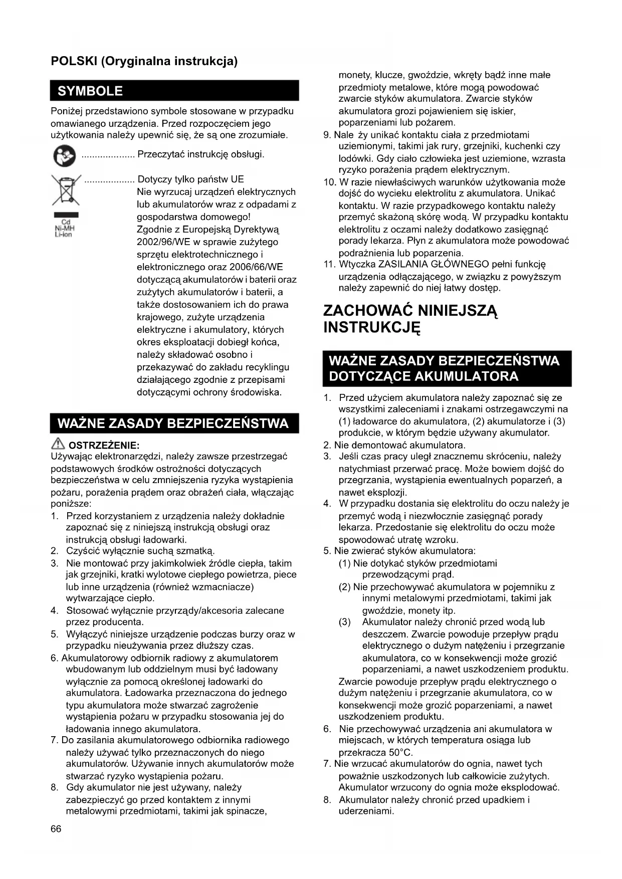ΠΡΟΔΙΑΓΡΑΦΕΣ66 POLSKI (Oryginalna instrukcja) Poniżej przedstawiono symbole stosowane w przypadku omawianego urządzenia. Przed rozpoczęciem jego użytkowania należy upewnić się, że są one zrozumiałe. .................... Przeczytać instrukcję obsługi. ................... Dotyczy tylko państw UE Nie wyrzucaj urządzeń elektrycznych lub akumulatorów wraz z odpadami z gospodarstwa domowego! Zgodnie z Europejską Dyrektywą 2002/96/WE w sprawie zużytego sprzętu elektrotechnicznego i elektronicznego oraz 2006/66/WE dotyczącą akumulatorów i baterii oraz zużytych akumulatorów i baterii, a także dostosowaniem ich do prawa krajowego, zużyte urządzenia elektryczne i akumulatory, których okres eksploatacji dobiegł końca, należy składować osobno i przekazywać do zakładu recyklingu działającego zgodnie z przepisami dotyczącymi ochrony środowiska. OSTRZEŻENIE: Używając elektronarzę dzi, należy zawsze przestrzegać podstawowych środków ostrożności dotyczących bezpieczeństwa w celu zmniejszenia ryzyka wystąpienia pożaru, porażenia prądem oraz obrażeń ciała, włączając poniższe: