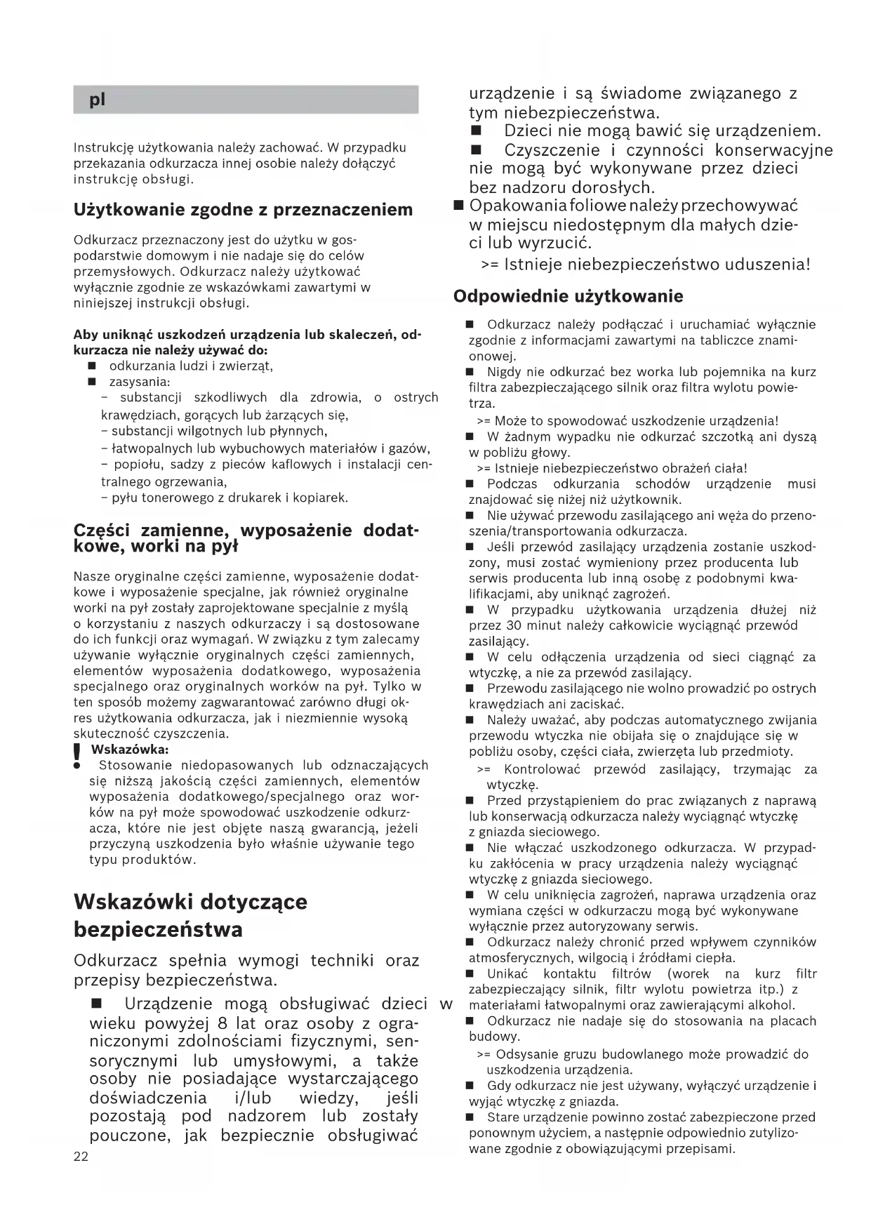 Wskazówka: Stosowanie niedopasowanych lub odznaczających się niższą jakością części zamiennych, elementów wyposażenia dodatkowego/specjalnego oraz wor- ków na pył może spowodować uszkodzenie odkurz- acza, które nie jest objęte naszą gwarancją, jeżeli przyczyną uszkodzenia było właśnie używanie tego typu produktów. Wskazówki dotyczące bezpieczeństwa Odkurzacz spełnia wymogi techniki oraz przepisy bezpieczeństwa. Urządzenie mogą obsługiwać dzieci w wieku powyżej 8 lat oraz osoby z ogra- niczonymi zdolnościami fizycznymi, sen- sorycznymi lub umysłowymi, a także osoby nie posiadające wystarczającego doświadczenia i/lub wiedzy, jeśli pozostają pod nadzorem lub zostały pouczone, jak bezpiecznie obsługiwać urządzenie i są świadome związanego z tym niebezpieczeństwa. Dzieci nie mogą bawić się urządzeniem. Czyszczenie i czynności konserwacyjne nie mogą być wykonywane przez dzieci bez nadzoru dorosłych. Opakowania foliowe należy przechowywać w miejscu niedostępnym dla małych dzie- ci lub wyrzucić. >= Istnieje niebezpieczeństwo uduszenia! Odpowiednie użytkowanie Odkurzacz należy podłączać i uruchamiać wyłącznie zgodnie z informacjami zawartymi na tabliczce znami- onowej. Nigdy nie odkurzać bez worka lub pojemnika na kurz filtra zabezpieczającego silnik oraz filtra wylotu powie- trza. >= Może to spowodować uszkodzenie urządzenia! W żadnym wypadku nie odkurzać szczotką ani dyszą w pobliżu głowy. >= Istnieje niebezpieczeństwo obrażeń ciała! Podczas odkurzania schodów urządzenie musi znajdować się niżej niż użytkownik. Nie używać przewodu zasilającego ani węża do przeno- szenia/transportowania odkurzacza. Jeśli przewód zasilający urządzenia zostanie uszkod- zony, musi zostać wymieniony przez producenta lub serwis producenta lub inną osobę z podobnymi kwa- lifikacjami, aby uniknąć zagrożeń. W przypadku użytkowania urządzenia dłużej niż przez 30 minut należy całkowicie wyciągnąć przewód zasilający. W celu odłączenia urządzenia od sieci ciągnąć za wtyczkę, a nie za przewód zasilający. Przewodu zasilającego nie wolno prowadzić po ostrych krawędziach ani zaciskać. Należy uważać, aby podczas automatycznego zwijania przewodu wtyczka nie obijała się o znajdujące się w pobliżu osoby, części ciała, zwierzęta lub przedmioty. >= Kontrolować przewód zasilający, trzymając za wtyczkę. Przed przystąpieniem do prac związanych z naprawą lub konserwacją odkurzacza należy wyciągnąć wtyczkę z gniazda sieciowego. Nie włączać uszkodzonego odkurzacza. W przypad- ku zakłócenia w pracy urządzenia należy wyciągnąć wtyczkę z gniazda sieciowego. W celu uniknięcia zagrożeń, naprawa urządzenia oraz wymiana części w odkurzaczu mogą być wykonywane wyłącznie przez autoryzowany serwis. Odkurzacz należy chronić przed wpływem czynników atmosferycznych, wilgocią i źródłami ciepła. Unikać kontaktu filtrów (worek na kurz filtr zabezpieczający silnik, filtr wylotu powietrza itp.) z materiałami łatwopalnymi oraz zawierającymi alkohol. Odkurzacz nie nadaje się do stosowania na placach budowy. >= Odsysanie gruzu budowlanego może prowadzić do uszkodzenia urządzenia. Gdy odkurzacz nie jest używany, wyłączyć urządzenie i wyjąć wtyczkę z gniazda. Stare urządzenie powinno zostać zabezpieczone przed ponownym użyciem, a następnie odpowiednio zutylizo- wane zgodnie z obowiązującymi przepisami. pl23