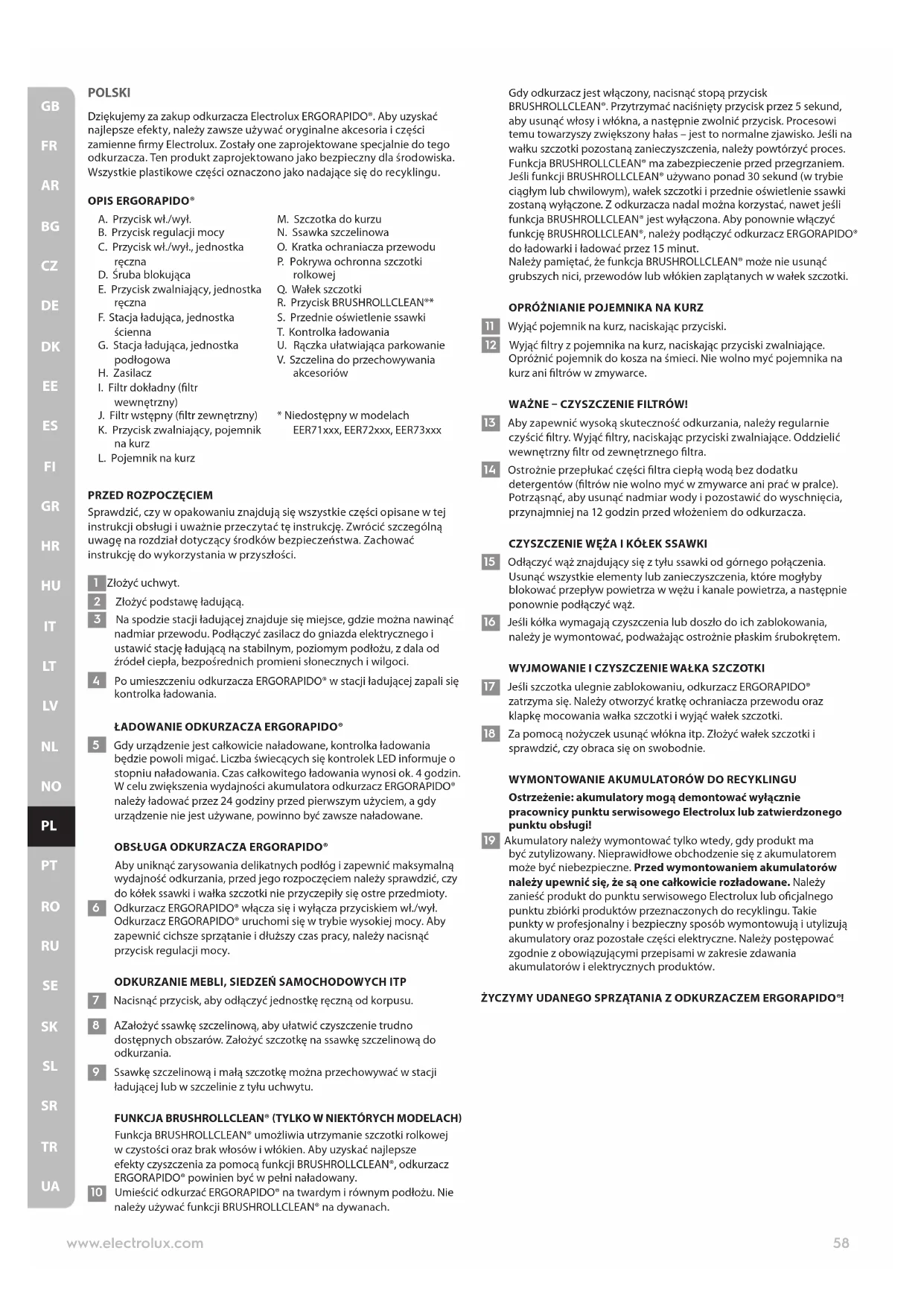 Ostrzeżenie: akumulatory mogą demontować wyłącznie pracownicy punktu serwisowego Electrolux lub zatwierdzonego punktu obsługi! 19 Akumulatory należy wymontować tylko wtedy, gdy produkt ma być zutylizowany. Nieprawidłowe obchodzenie się z akumulatorem może być niebezpieczne. Przed wymontowaniem akumulatorów należy upewnić się, że są one całkowicie rozładowane. Należy zanieść produkt do punktu serwisowego Electrolux lub ocjalnego punktu zbiórki produktów przeznaczonych do recyklingu. Takie punkty w profesjonalny i bezpieczny sposób wymontowują i utylizują akumulatory oraz pozostałe części elektryczne. Należy postępować zgodnie z obowiązującymi przepisami w zakresie zdawania akumulatorów i elektrycznych produktów. ŻYCZYMY UDANEGO SPRZĄTANIA Z ODKURZACZEM ERGORAPIDO®! 58www.electrolux.com