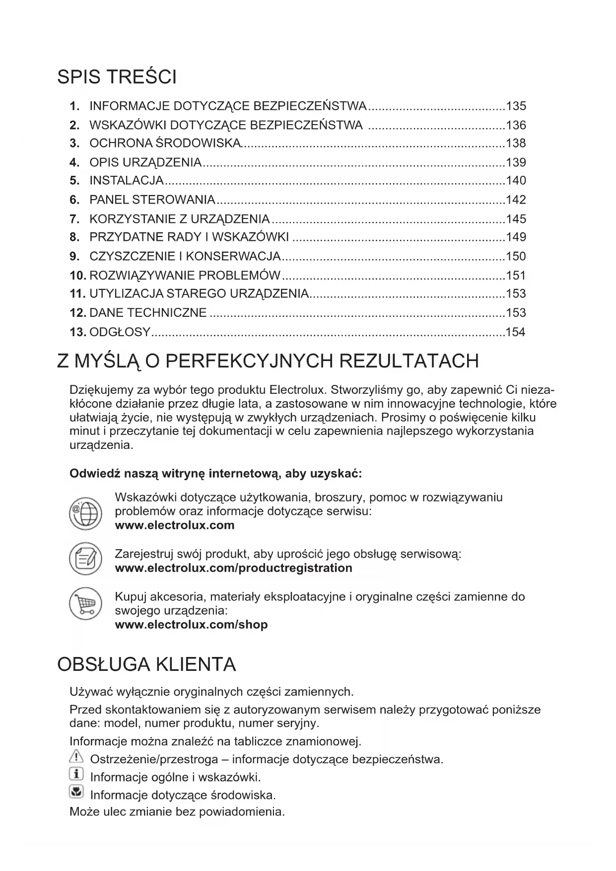 Dziękujemy za wybór tego produktu Electrolux. Stworzyliśmy go, aby zapewnić Ci nieza- kłócone działanie przez długie lata, a zastosowane w nim innowacyjne technologie, które ułatwiają życie, nie występują w zwykłych urządzeniach. Prosimy o poświęcenie kilku minut i przeczytanie tej dokumentacji w celu zapewnienia najlepszego wykorzystania urządzenia. Odwiedź naszą witrynę internetową, aby uzyskać: Wskazówki dotyczące użytkowania, broszury, pomoc w rozwiązywaniu problemów oraz informacje dotyczące serwisu: www.electrolux.com Zarejestruj swój produkt, aby uprościć jego obsługę serwisową: www.electrolux.com/productregistration Kupuj akcesoria, materiały eksploatacyjne i oryginalne części zamienne do swojego urządzenia: www.electrolux.com/shop