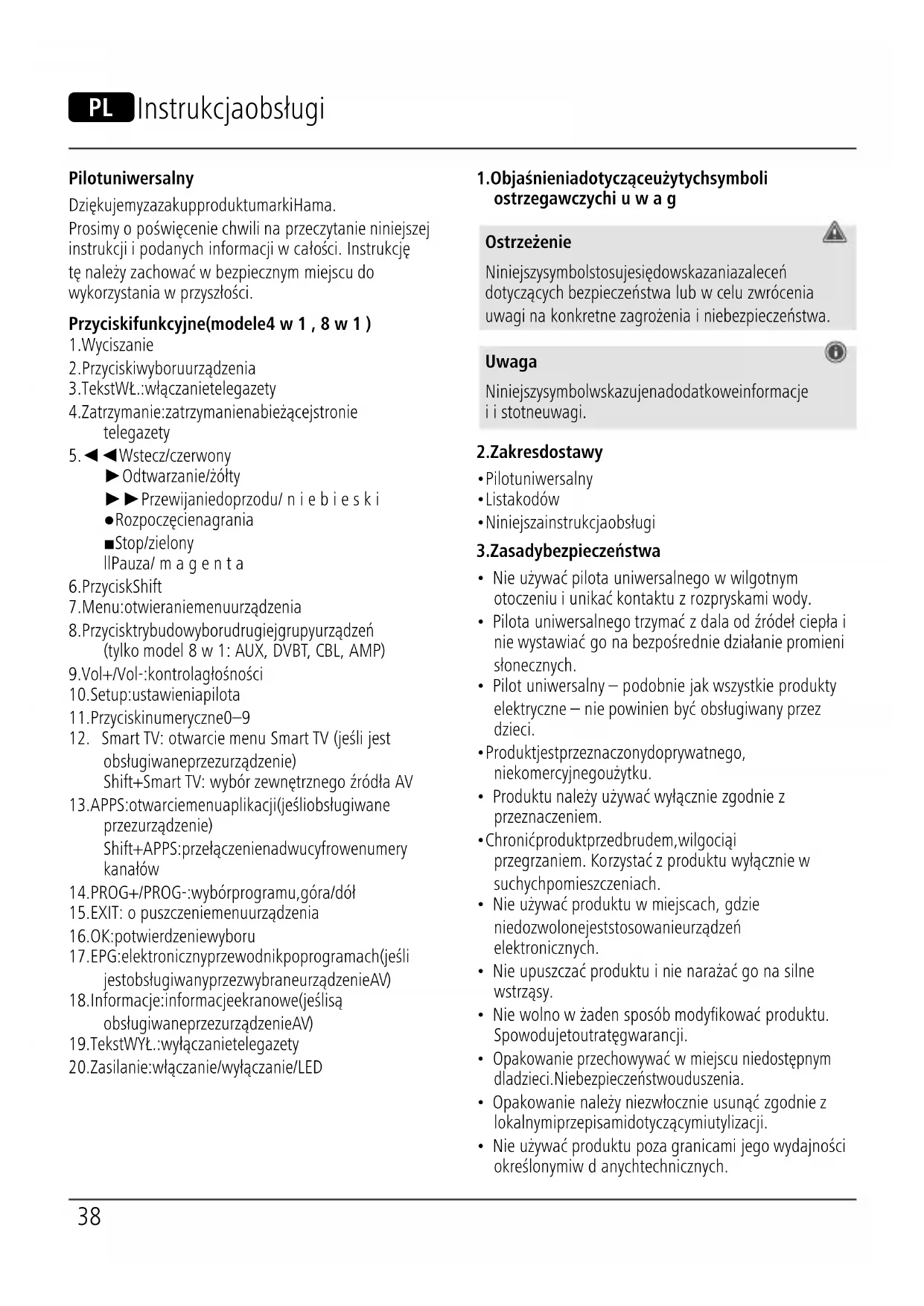 Wskazówki dotyczące ochrony środowiska: Od czasu wprowadzenia europejskiej dyrektywy 2012/19/EU i2006/66/SU do prawa narodowego obowiązują następujące ustalenia: Urządzeń elektrycznych, elektronicznych oraz baterii jednorazowych nie należywyrzucać wraz zodpadami gospodarstwa domowego. Konsumenci są prawnie zobowiązani do zwrotu sprzętu elektrycznego ielektronicznego oraz baterii iakumulatorów po zakończeniu okresu ich eksploatacji do publicznych punktów zbiórki lub do punktu sprzedaży. Szczegółowe kwestie regulują przepisy prawne danego kraju. Informuje otym symbol umieszczony na opakowaniu, na produkcie lub w instrukcji obsługi. Ponowne wykorzystanie, odzysk lub inne formy recyklingu starego sprzętu/akumulatorów ibaterii stanowią ważny wkład wochronę naszego środowiska.44 H Használati útmutató Univerzális távirányító Köszönjük, hogy aHama termékét választotta. Szánjon rá időtéselőször olvassa el az alábbi utasításokat, információkat. Biztonságos helyen őrizze meg az útmutatót későbbi használatrais. Funkciógombok (4 in 1, 8in1modellek)