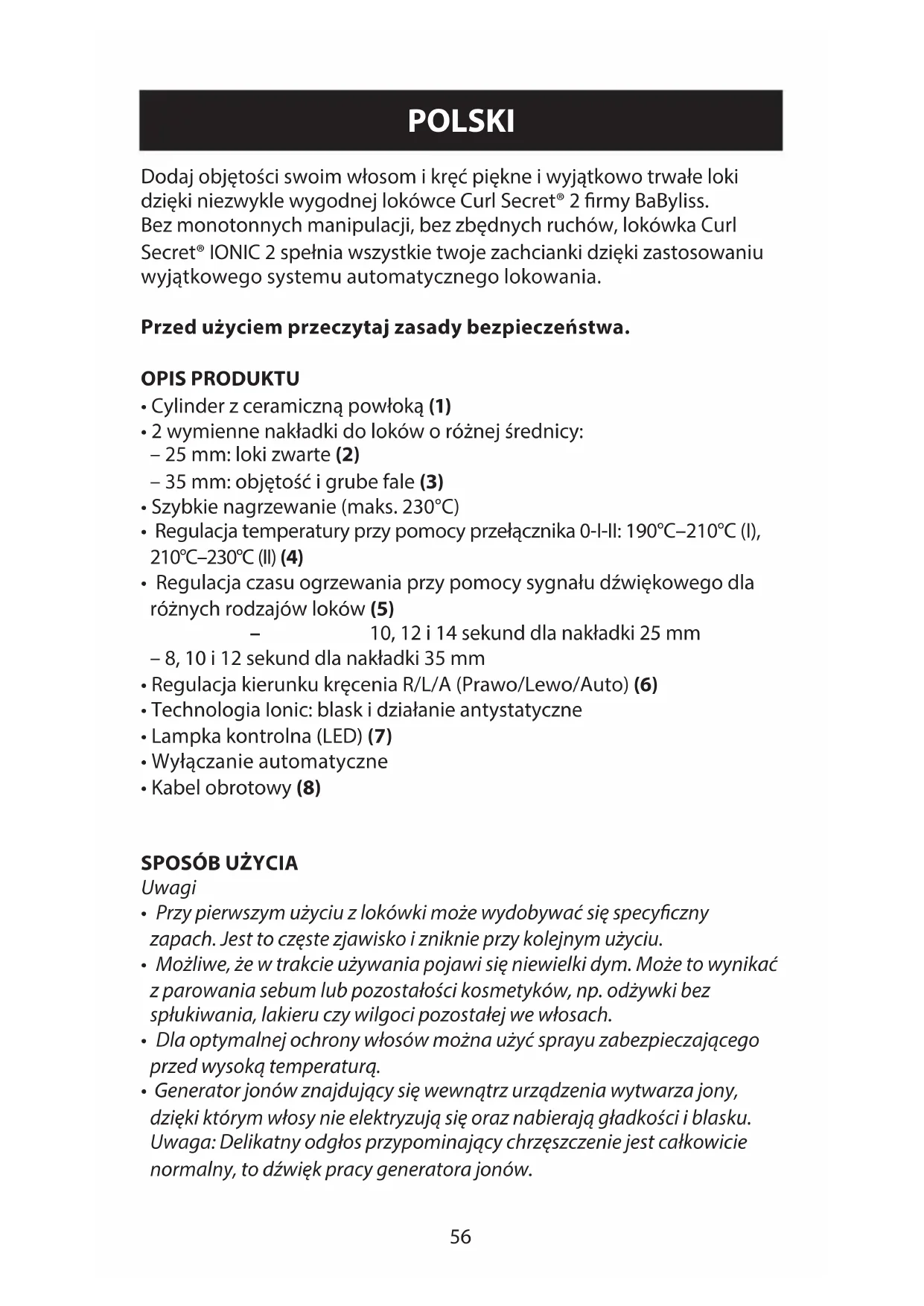 POLSKI Dodaj objętości swoim włosom i kręć piękne i wyjątkowo trwałe loki dzięki niezwykle wygodnej lokówce Curl Secret® 2 rmy BaByliss. Bez monotonnych manipulacji, bez zbędnych ruchów, lokówka Curl Secret® IONIC 2 spełnia wszystkie twoje zachcianki dzięki zastosowaniu wyjątkowego systemu automatycznego lokowania. Przed użyciem przeczytaj zasady bezpieczeństwa. OPIS PRODUKTU