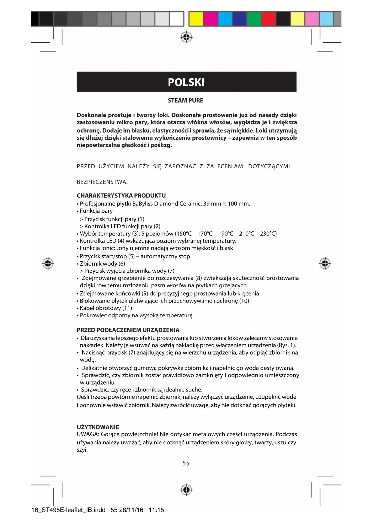 - A fűtőlapok hatékony megóvása érdekében tárolás előtt zárja össze a fűtőlapokat a fűtőlap rögzítő (10) segítségével. 16_ST495E-leaflet_IB.indd 54 28/11/16 11:1555 POLSKI STEAM PURE Doskonale prostuje i tworzy loki. Doskonałe prostowanie już od nasady dzięki zastosowaniu mikro pary, która otacza włókna włosów, wygładza je i zwiększa ochronę. Dodaje im blasku, elastyczności i sprawia, że są miękkie. Loki utrzymują się dłużej dzięki stalowemu wykończeniu prostownicy – zapewnia w ten sposób niepowtarzalną gładkość i poślizg. PRZED UŻYCIEM NALEŻY SIĘ ZAPOZNAĆ Z ZALECENIAMI DOTYCZĄCYMI BEZPIECZEŃSTWA. CHARAKTERYSTYKA PRODUKTU