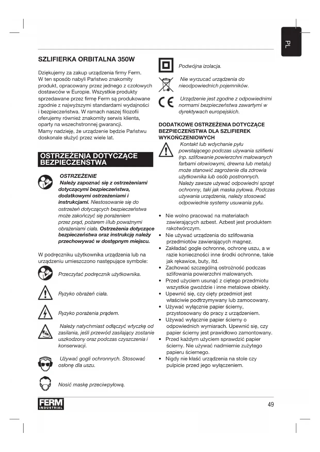 WYKOŃCZENIOWYCH Kontakt lub wdychanie pyłu powstającego podczas używania szlifierki (np. szlifowanie powierzchni malowanych farbami ołowiowymi, drewna lub metalu) może stanowić zagrożenie dla zdrowia użytkownika lub osób postronnych. Należy zawsze używać odpowiedni sprzęt ochronny, taki jak maska pyłowa. Podczas używania urządzenia, należy stosować odpowiednie systemy usuwania pyłu.