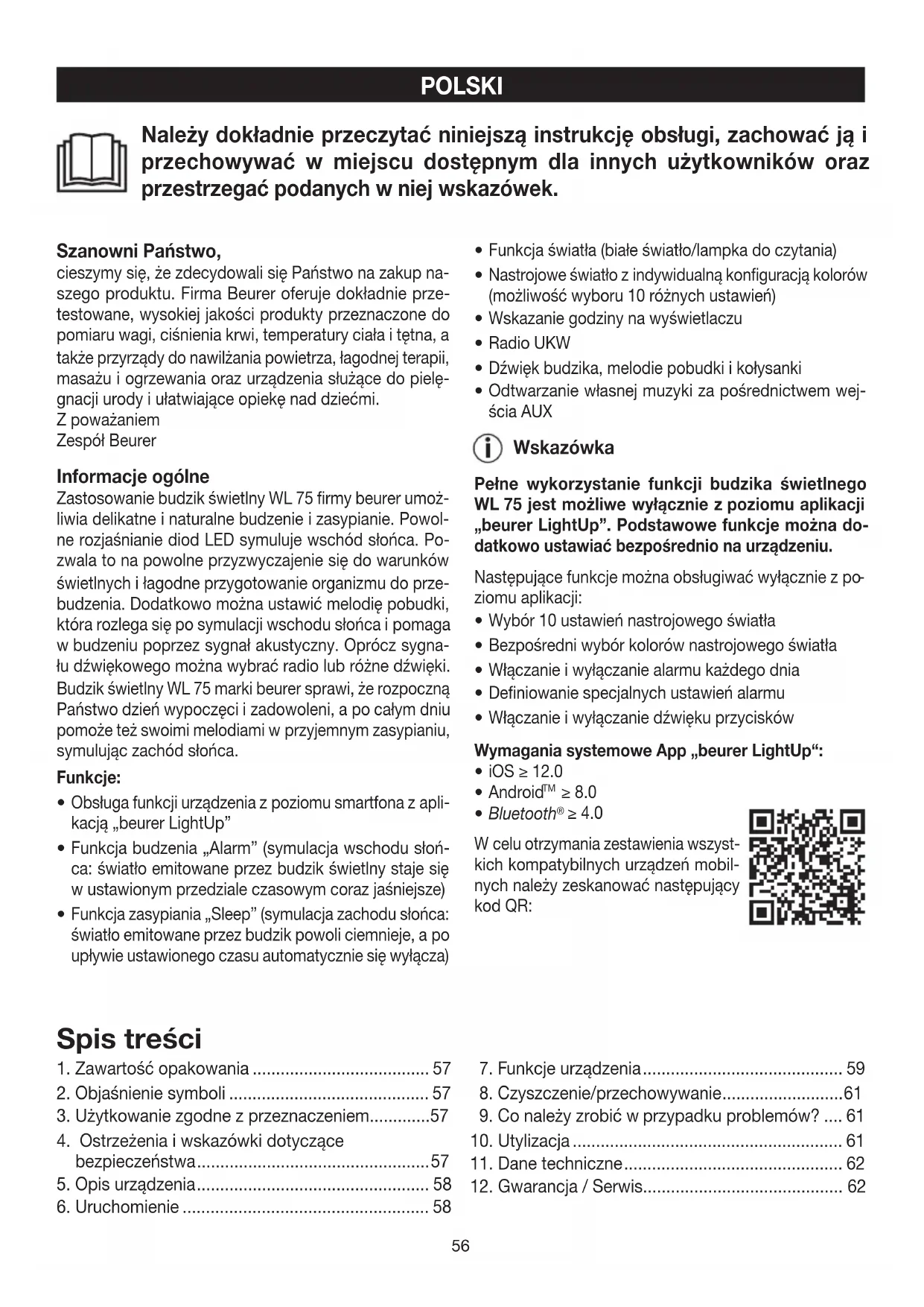 Обслуживание Более подробная информация по гарантии/сервису находится в гарантийном/сервисном талоне, который входит в комплект поставки. Возможны ошибки иизменения56 Szanowni Państwo, cieszymy się, że zdecydowali się Państwo na zakup na-szego produktu. Firma Beurer oferuje dokładnie prze-testowane, wysokiej jakości produkty przeznaczone do pomiaru wagi, ciśnienia krwi, temperatury ciała i tętna, a także przyrządy do nawilżania powietrza, łagodnej terapii, masażu i ogrzewania oraz urządzenia służące do pielę-gnacji urody i ułatwiające opiekę nad dziećmi.Z poważaniem Zespół Beurer Informacje ogólne Zastosowanie budzik świetlny WL 75 firmy beurer umoż-liwia delikatne inaturalne budzenie izasypianie. Powol-ne rozjaśnianie diod LED symuluje wschód słońca. Po-zwala to na powolne przyzwyczajenie się do warunków świetlnych iłagodne przygotowanie organizmu do prze-budzenia. Dodatkowo można ustawić melodię pobudki, która rozlega się po symulacji wschodu słońca ipomaga wbudzeniu poprzez sygnał akustyczny. Oprócz sygna-łu dźwiękowego można wybrać radio lub różne dźwięki. Budzik świetlny WL 75 marki beurer sprawi, że rozpoczną Państwo dzień wypoczęci izadowoleni, apo całym dniu pomoże też swoimi melodiami wprzyjemnym zasypianiu, symulując zachód słońca.Funkcje: Obsługa funkcji urządzenia zpoziomu smartfona zapli-kacją „beurer LightUp” Funkcja budzenia „Alarm” (symulacja wschodu słoń-ca: światło emitowane przez budzik świetlny staje się wustawionym przedziale czasowym coraz jaśniejsze) Funkcja zasypiania „Sleep” (symulacja zachodu słońca: światło emitowane przez budzik powoli ciemnieje, apo upływie ustawionego czasu automatycznie się wyłącza) Funkcja światła (białe światło/lampka do czytania) Nastrojowe światło zindywidualną konfiguracją kolorów (możliwość wyboru 10 różnych ustawień) Wskazanie godziny na wyświetlaczu Radio UKW Dźwięk budzika, melodie pobudki ikołysanki Odtwarzanie własnej muzyki za pośrednictwem wej-ścia AUX Wskazówka Pełne wykorzystanie funkcji budzika świetlnego WL75 jest możliwe wyłącznie zpoziomu aplikacji „beurer LightUp”. Podstawowe funkcje można do-datkowo ustawiać bezpośrednio na urządzeniu.Następujące funkcje można obsługiwać wyłącznie zpo ziomu aplikacji: Wybór 10 ustawień nastrojowego światła Bezpośredni wybór kolorów nastrojowego światła Włączanie iwyłączanie alarmu każdego dnia Definiowanie specjalnych ustawień alarmu Włączanie iwyłączanie dźwięku przyciskówWymagania systemowe App „beurer LightUp“: iOS ≥ 12.0 Android ≥ 8.0 Bluetooth ≥ 4.0Wcelu otrzymania zestawienia wszyst-kich kompatybilnych urządzeń mobil-nych należy zeskanować następujący kod QR: Należy dokładnie przeczytać niniejszą instrukcję obsługi, zachować ją i przechowywać w miejscu dostępnym dla innych użytkowników oraz przestrzegać podanych w niej wskazówek. POLSKI Spis treści