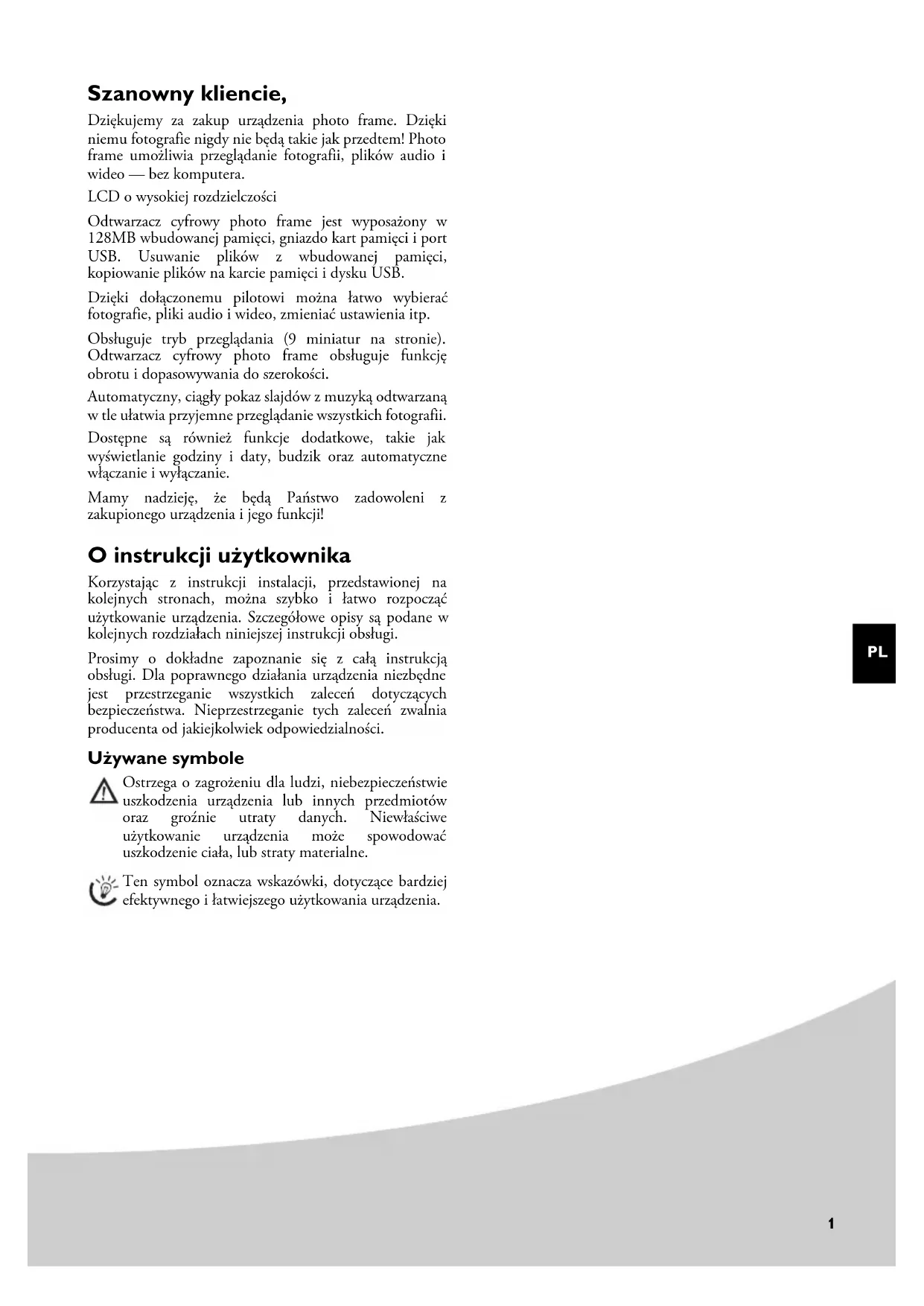 Dziękujemy za zakup urządzenia photo frame. Dzięki niemu fotografie nigdy nie będą takie jak przedtem! Photo frame umożliwia przeglądanie fotografii, plików audio i wideo — bez komputera.