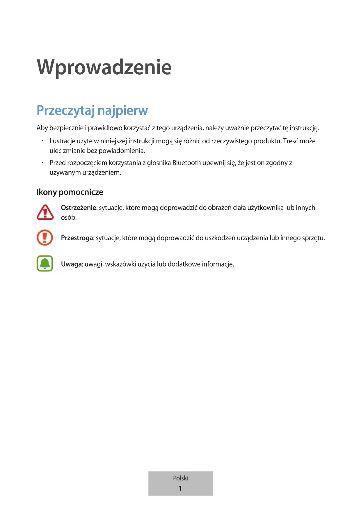 Przed rozpoczęciem korzystania z głośnika Bluetooth upewnij się, że jest on zgodny z używanym urządzeniem. Ikony pomocnicze Ostrzeżenie: sytuacje, które mogą doprowadzić do obrażeń ciała użytkownika lub innych osób. Przestroga: sytuacje, które mogą doprowadzić do uszkodzeń urządzenia lub innego sprzętu. Uwaga: uwagi, wskazówki użycia lub dodatkowe informacje. Polsk i 1Wprowadzenie