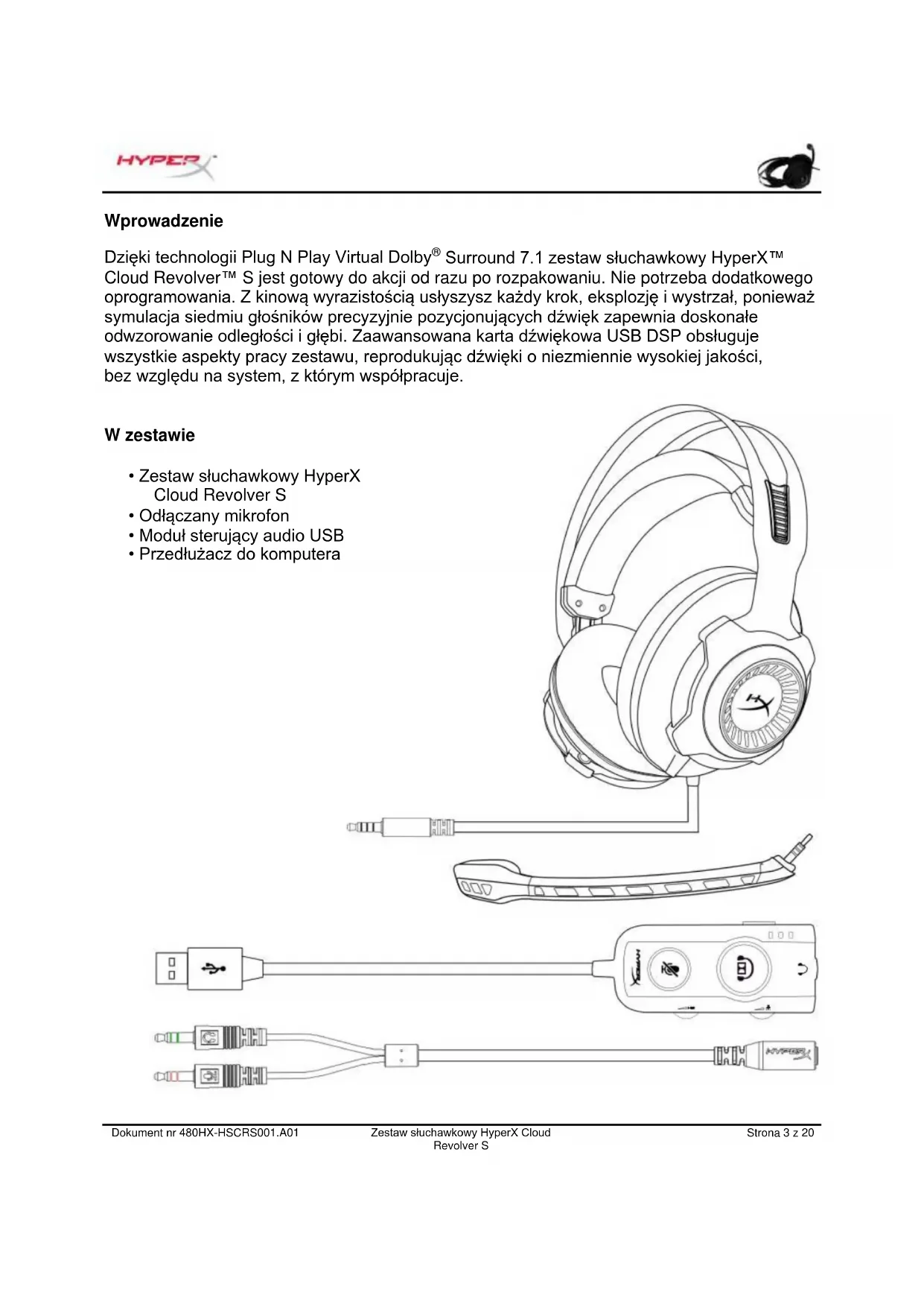 Użytkowanie zestawu z urządzeniami mobilnymi ................................................................. 20Dokument nr 480HX-HSCRS001.A01 Zestaw słuchawkowy HyperX Cloud Revolver S Strona 3 z 20 Wprowadzenie Dzięki technologii Plug N Play Virtual Dolby