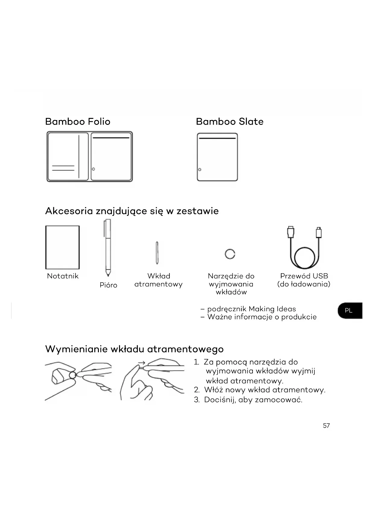 Bamboo Folio Akcesoria znajdujące się w zestawie Wymienianie wkładu atramentowego – podręcznik Making Ideas – Ważne informacje o produkcie
