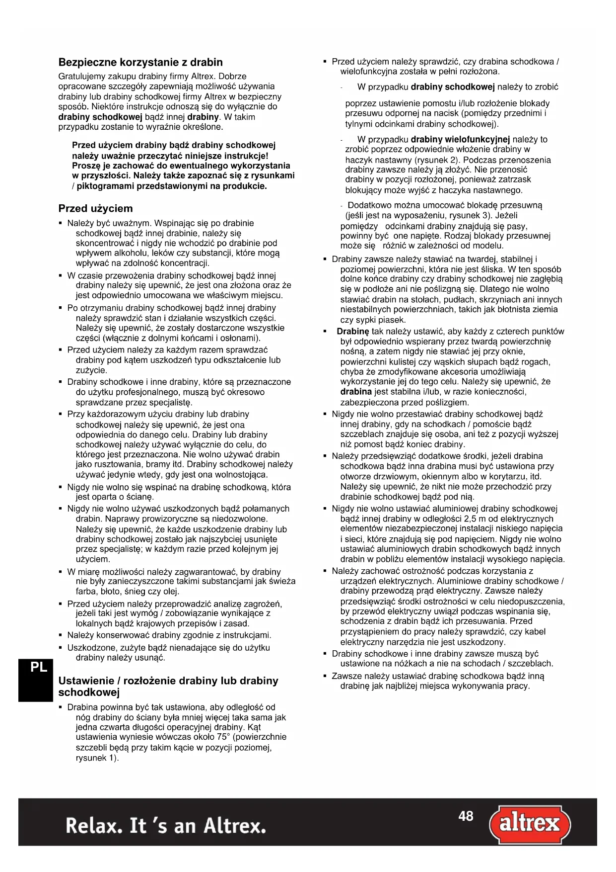 Bezpieczne korzystanie z drabin Gratulujemy zakupu drabiny firmy Altrex. Dobrze opracowane szczegóły zapewniają możliwość używania drabiny lub drabiny schodkowej firmy Altrex w bezpieczny sposób. Niektóre instrukcje odnoszą się do wyłącznie do drabiny schodkowej bądź innej drabiny. W takim przypadku zostanie to wyraźnie określone. Przed użyciem drabiny bądź drabiny schodkowej należy uważnie przeczytać niniejsze instrukcje! Proszę je zachować do ewentualnego wykorzystania w przyszłości. Należy także zapoznać się z rysunkami / piktogramami przedstawionymi na produkcie. Przed użyciem Należy być uważnym. Wspinając się po drabinie schodkowej bądź innej drabinie, należy się skoncentrować i nigdy nie wchodzić po drabinie pod wpływem alkoholu, leków czy substancji, które mogą wpływać na zdolność koncentracji. W czasie przewożenia drabiny schodkowej bądź innej drabiny należy się upewnić, że jest ona złożona oraz że jest odpowiednio umocowana we właściwym miejscu. Po otrzymaniu drabiny schodkowej bądź innej drabiny należy sprawdzić stan i działanie wszystkich części. Należy się upewnić, że zostały dostarczone wszystkie części (włącznie z dolnymi końcami i osłonami). Przed użyciem należy za każdym razem sprawdzać drabiny pod kątem uszkodzeń typu odkształcenie lub zużycie. Drabiny schodkowe i inne drabiny, które są przeznaczone do użytku profesjonalnego, muszą być okresowo sprawdzane przez specjalistę. Przy każdorazowym użyciu drabiny lub drabiny schodkowej należy się upewnić, że jest ona odpowiednia do danego celu. Drabiny lub drabiny schodkowej należy używać wyłącznie do celu, do którego jest przeznaczona. Nie wolno używać drabin jako rusztowania, bramy itd. Drabiny schodkowej należy używać jedynie wtedy, gdy jest ona wolnostojąca. Nigdy nie wolno się wspinać na drabinę schodkową, która jest oparta o ścianę. Nigdy nie wolno używać uszkodzonych bądź połamanych drabin. Naprawy prowizoryczne są niedozwolone. Należy się upewnić, że każde uszkodzenie drabiny lub drabiny schodkowej zostało jak najszybciej usunięte przez specjalistę; w każdym razie przed kolejnym jej użyciem. W miarę możliwości należy zagwarantować, by drabiny nie były zanieczyszczone takimi substancjami jak świeża farba, błoto, śnieg czy olej. Przed użyciem należy przeprowadzić analizę zagrożeń, jeżeli taki jest wymóg / zobowiązanie wynikające z lokalnych bądź krajowych przepisów i zasad. Należy konserwować drabiny zgodnie z instrukcjami. Uszkodzone, zużyte bądź nienadające się do użytku drabiny należy usunąć. Ustawienie / rozłożenie drabiny lub drabiny schodkowej Drabina powinna być tak ustawiona, aby odległość od nóg drabiny do ściany była mniej więcej taka sama jak jedna czwarta długości operacyjnej drabiny. Kąt ustawienia wyniesie wówczas około 75° (powierzchnie szczebli będą przy takim kącie w pozycji poziomej, rysunek 1).