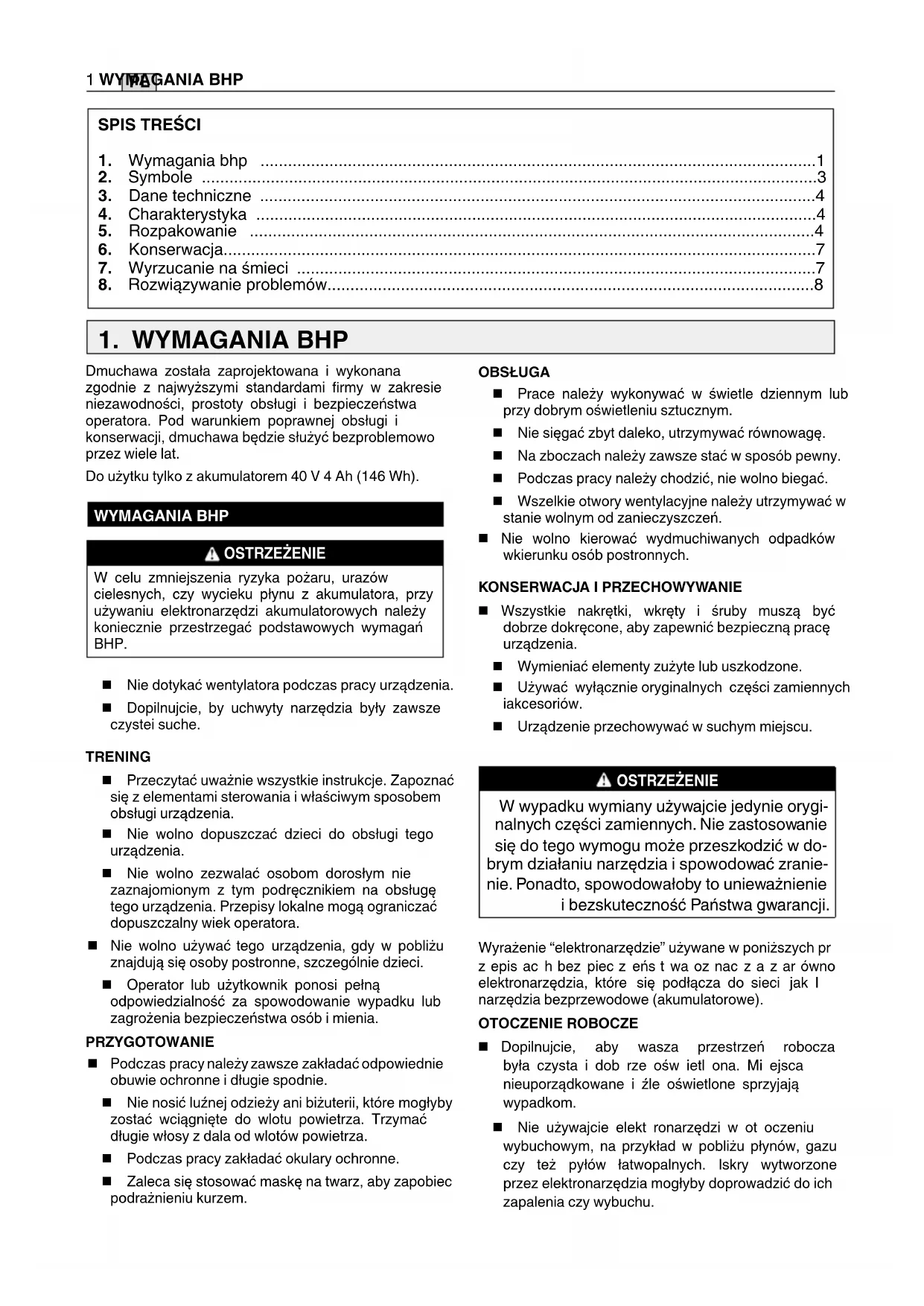 Dmuchawa została zaprojektowana i wykonana zgodnie z najwyższymi standardami rmy w zakresie niezawodności, prostoty obsługi i bezpieczeństwa operatora. Pod warunkiem poprawnej obsługi i konserwacji, dmuchawa będzie służyć bezproblemowo przez wiele lat. Do użytku tylko z akumulatorem 40 V 4 Ah (146 Wh). WYMAGANIA BHP OSTRZEŻENIE W celu zmniejszenia ryzyka pożaru, urazów cielesnych, czy wycieku płynu z akumulatora, przy używaniu elektronarzędzi akumulatorowych należy koniecznie przestrzegać podstawowych wymagań BHP. Nie dotykać wentylatora podczas pracy urządzenia. Dopilnujcie, by uchwyty narzędzia były zawsze czystei suche. TRENING Przeczytać uważnie wszystkie instrukcje. Zapoznać się z elementami sterowania i właściwym sposobem obsługi urządzenia. Nie wolno dopuszczać dzieci do obsługi tego urządzenia. Nie wolno zezwalać osobom dorosłym nie zaznajomionym z tym podręcznikiem na obsługę tego urządzenia. Przepisy lokalne mogą ograniczać dopuszczalny wiek operatora. Nie wolno używać tego urządzenia, gdy w pobliżu znajdują się osoby postronne, szczególnie dzieci. Operator lub użytkownik ponosi pełną odpowiedzialność za spowodowanie wypadku lub zagrożenia bezpieczeństwa osób i mienia. PRZYGOTOWANIE Podczas pracy należy zawsze zakładać odpowiednie obuwie ochronne i długie spodnie. Nie nosić luźnej odzieży ani biżuterii, które mogłyby zostać wciągnięte do wlotu powietrza. Trzymać długie włosy z dala od wlotów powietrza. Podczas pracy zakładać okulary ochronne. Zaleca się stosować maskę na twarz, aby zapobiec podrażnieniu kurzem. OBSłUGA Prace należy wykonywać w świetle dziennym lub przy dobrym oświetleniu sztucznym. Nie sięgać zbyt daleko, utrzymywać równowagę. Na zboczach należy zawsze stać w sposób pewny. Podczas pracy należy chodzić, nie wolno biegać. Wszelkie otwory wentylacyjne należy utrzymywać w stanie wolnym od zanieczyszczeń. Nie wolno kierować wydmuchiwanych odpadków wkierunku osób postronnych.