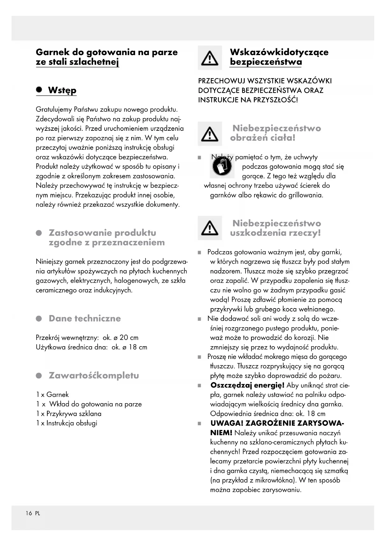 Zawartość kompletu 1 x Garnek 1 x Wkład do gotowania na parze 1 x Przykrywa szklana 1 x Instrukcja obsługi Wskazówki dotyczące bezpieczeństwa
