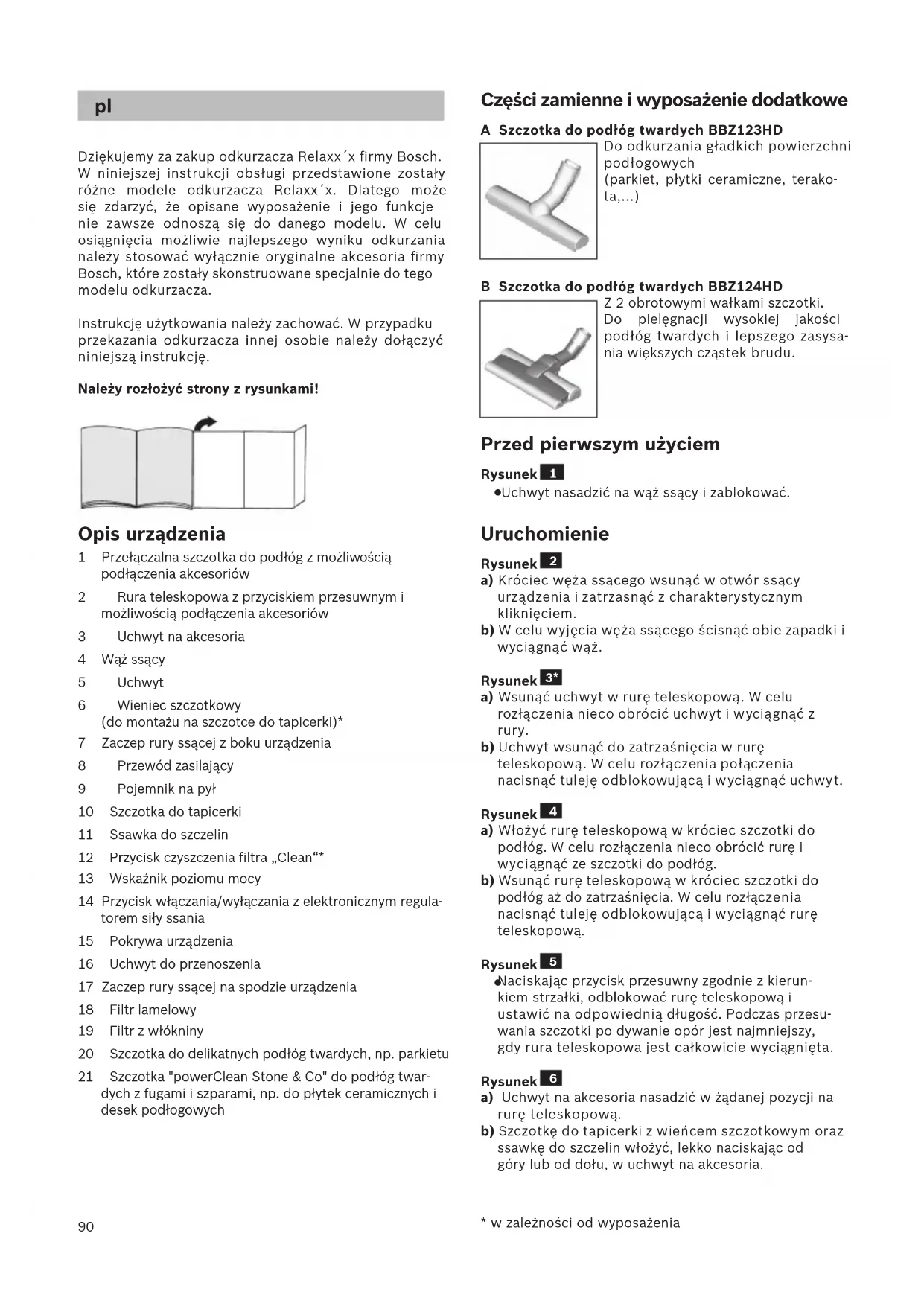 Dziękujemy za zakup odkurzacza Relaxx´x firmy Bosch. W niniejszej instrukcji obsługi przedstawione zostały różne modele odkurzacza Relaxx´x. Dlatego może się zdarzyć, że opisane wyposażenie i jego funkcje nie zawsze odnoszą się do danego modelu. W celu osiągnięcia możliwie najlepszego wyniku odkurzania należy stosować wyłącznie oryginalne akcesoria firmy Bosch, które zostały skonstruowane specjalnie do tego modelu odkurzacza. Instrukcję użytkowania należy zachować. W przypadku przekazania odkurzacza innej osobie należy dołączyć niniejszą instrukcję. Należy rozłożyć strony z rysunkami! Opis urządzenia 1 Przełączalna szczotka do podłóg z możliwością podłączenia akcesoriów 2 Rura teleskopowa z przyciskiem przesuwnym i możliwością podłączenia akcesoriów 3 Uchwyt na akcesoria 4 Wąż ssący 5 Uchwyt 6 Wieniec szczotkowy (do montażu na szczotce do tapicerki)* 7 Zaczep rury ssącej z boku urządzenia 8 Przewód zasilający 9 Pojemnik na pył 10 Szczotka do tapicerki 11 Ssawka do szczelin 12 Przycisk czyszczenia filtra „Clean“* 13 Wskaźnik poziomu mocy 14 Przycisk włączania/wyłączania z elektronicznym regula- torem siły ssania 15 Pokrywa urządzenia 16 Uchwyt do przenoszenia 17 Zaczep rury ssącej na spodzie urządzenia 18 Filtr lamelowy 19 Filtr z włókniny 20 Szczotka do delikatnych podłóg twardych, np. parkietu 21 Szczotka "powerClean Stone & Co" do podłóg twar- dych z fugami i szparami, np. do płytek ceramicznych i desek podłogowych
