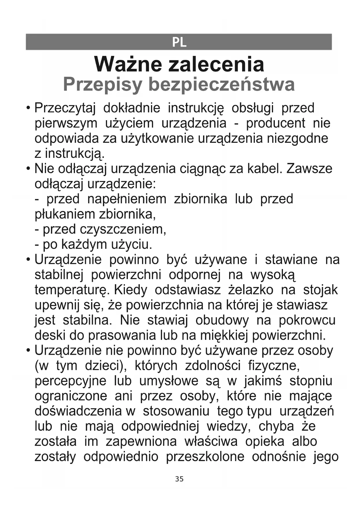 - Urządzenie nie powinno być używane przez osoby (w tym dzieci), których zdolności fizyczne, percepcyjne lub umysłowe są w jakimś stopniu ograniczone ani przez osoby, które nie mające doświadczenia w stosowaniu tego typu urządzeń lub nie mają odpowiedniej wiedzy, chyba że została im zapewniona właściwa opieka albo zostały odpowiednio przeszkolone odnośnie jego 1800129556 GV83XX-GV84XX E0 A11_110x154 25/03/13 14:43 Page3536 stosowania przez osobę odpowiedzialną za ich bezpieczeństwo.