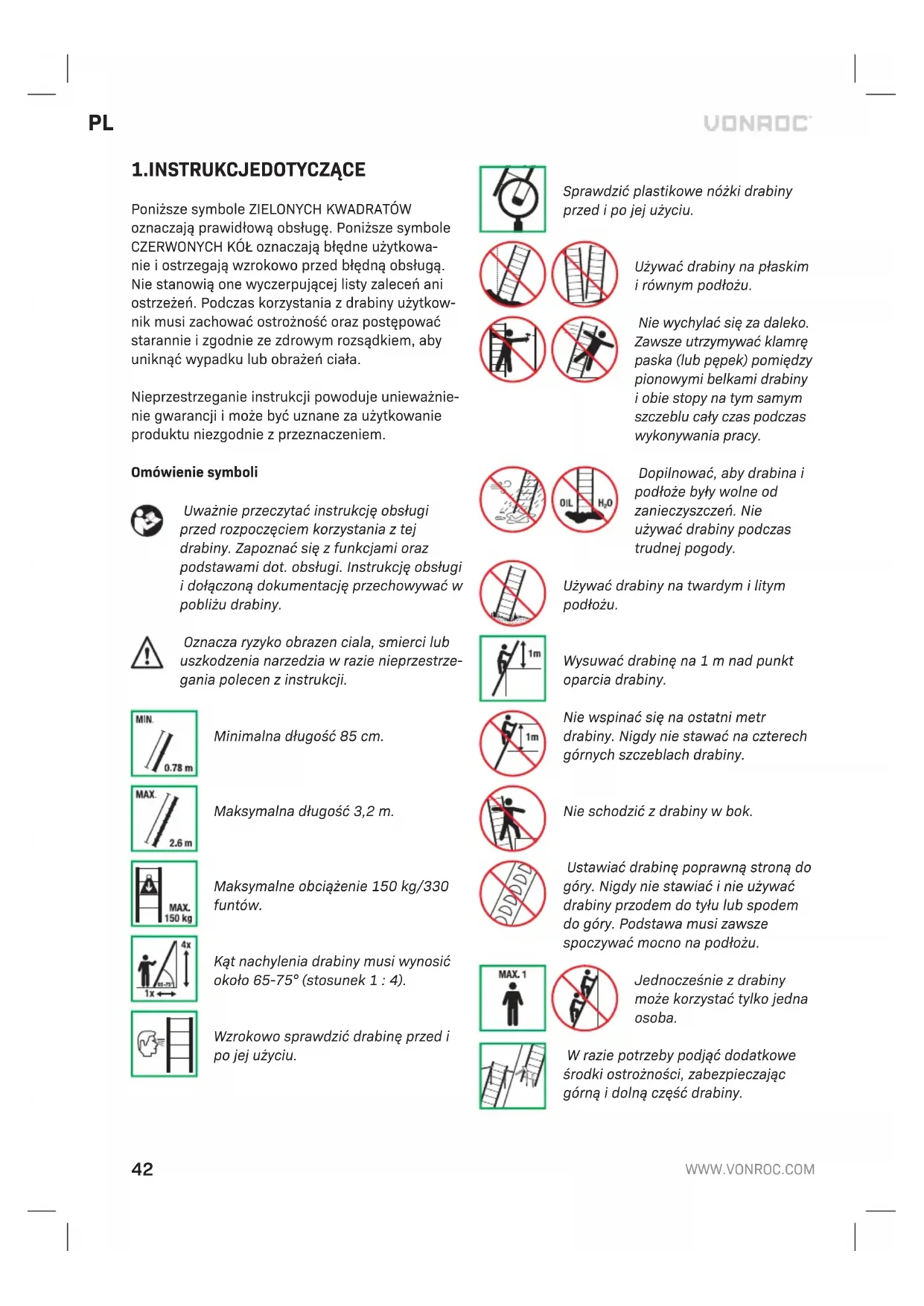 Drabina jest przeznaczona do bezproblemo- wej pracy przez długi okres i wymaga jedynie niewielkiej konserwacji. Trwałość stołu można zwiększyć, regularnie go czyszcząc i obchodząc się z nim pra- widłowo. Całkowicie złożyć drabinę, pamiętając o złożeniu wszystkich szczebli, a następnie zabezpieczyć ją przed rozpoczęciem przechowywania lub przenoszenia. Czyszczenie Regularnie czyścić drabinę miękką ściereczką, najlepiej po każdym użyciu. Czyścić odpowiednim środkiem czyszczącym do gospodarstw domowych i miękką, suchą ściereczką. Nie zanurzać drabiny w wodzie ani innej cieczy pod żadnym pozorem. Nie używać rozpuszczalników (benzyny, alkoholu, amoniaku itp.), ponieważ spowoduje to uszkodze- nie części z tworzyw sztucznych. Przechowywanie Przechowywać drabinę w pomieszczeniu w suchym miejscu z dala od zanieczyszczeń. Nie opierać żadnych przedmiotów o drabinę. Przechowywać drabinę tylko wtedy, gdy jest sucha. Chronić drabinę przed wilgocią, która może spowodować jej uszkodzenie. Przechowywać drabinę popra- wną stroną do góry. Podstawa powinna zawsze spoczywać na podłożu. Przechowywać w miejscu niedostępnym dla dzieci. Konserwacja Nigdy nie używać uszkodzonej lub pękniętej dra- biny. Nie wolno przeprowadzać prowizorycznych napraw. Sprawdzić plastikowe nóżki drabiny przed i po jej użyciu. Nie używać drabiny bez plastikowych nóżek lub ze zużytymi plastikowymi nóżkami. Na górze drabiny znajdują się plastikowe pokrywki, które chronią drabinę przed przedostawaniem się kurzu i innych zanieczyszczeń do jej wnętrza. Sprawdzić plastikowe nóżki drabiny przed i po jej użyciu. Naprawy i konserwację może wykonywać jedynie odpowiednio wykwalifikowana osoba z użyciem odpowiednich części zamiennych. Nie zalecamy korzystania z niezatwierdzonych przez producenta części zamiennych innych firm, a użycie takich części spowoduje unieważnienie gwarancji. GWARANCJA Produkty VONROC są wytwarzane zgodnie z naj- wyższymi standardami jakości i producent udziela gwarancji na wady materiałowe i wady wykonania na okres wymagany prawem, licząc od dnia zaku- pu. Jeśli wystąpi usterka produktu w tym okresie spowodowana wadą materiałową i/lub wadą wykonania, proszę bezpośrednio skontaktować się ze sprzedawcą VONROC. Następujące okoliczności powodują unieważnienie gwarancji: