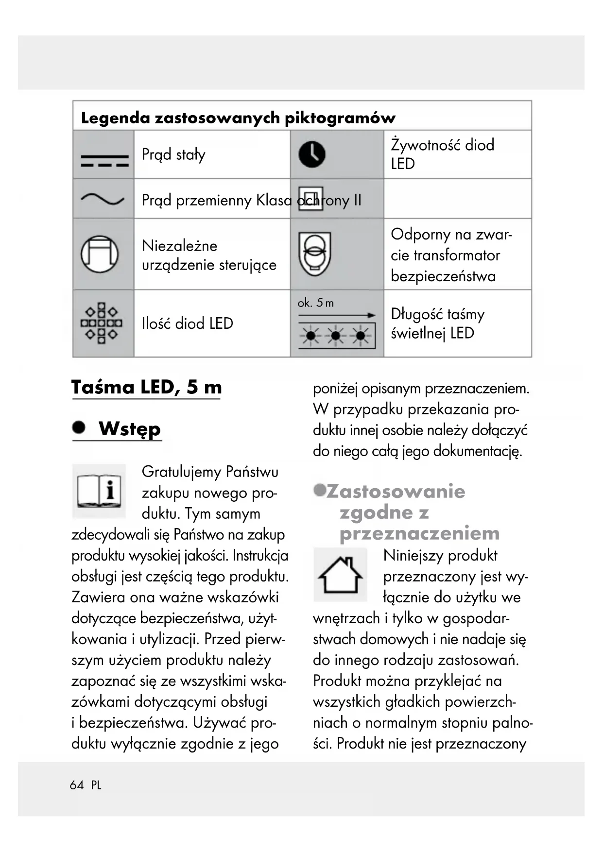 -mail contact met de onderstaande service-afdeling op te nemen. Een als defect geregistreerd pro- duct kunt u dan samen met uw aankoopbewijs (kassabon) en vermelding van de concrete schade alsmede het tijdstip van optreden voor u franco aan het u meege- deelde servicepunt verzenden. Service Service Nederland Tel.: 0900 0400 223 (0,10 EUR / Min.) E-Mail: owim@lidl.nl Service Belgiё Tel.: 070 270 171 (0,15 EUR / Min.) E-Mail: owim@lidl.be63 PL Legenda zastosowanych piktogramów ............................................................... Strona 64 Wstęp .................................................................................. Strona 64 Zastosowanie zgodne z przeznaczeniem ......................... Strona 64 Opis części ........................................................................... Strona 65 Dane techniczne .................................................................. Strona 65 Zawartość ............................................................................. Strona 66 Wskazówki bezpieczeństwa .......................... Strona 66 Wskazówki bezpieczeństwa dla baterii / akumulatorów.... Strona 69 Przed uruchomieniem ........................................... Strona 70 Montaż ............................................................................... Strona 70 Uruchomienie................................................................ Strona 73 Włączanie / wyłączanie produktu pilotem na podczerwień ......................................................................... Strona 73 Sterowanie efektami świetlnymi za pomocą pilota na podczerwień ......................................................................... Strona 73 Wymiana baterii .................................................................. Strona 74 Czyszczenie i pielęgnacja ................................... Strona 74 Utylizacja ......................................................................... Strona 74 Gwarancja ...................................................................... Strona 75 Sposób postępowania w przypadku naprawy gwarancyjnej ........................................................................ Strona 76 Serwis ................................................................................... Strona 7764 PL Legenda zastosowanych piktogramów Prąd stały Żywotność diod LED Prąd przemienny Klasa ochrony II Niezależne urządzenie sterujące Odporny na zwar- cie transformator bezpieczeństwa Ilość diod LED ok. 5 m Długość taśmy świetlnej LED Taśma LED, 5 m Wstęp Gratulujemy Państwu zakupu nowego pro- duktu. Tym samym zdecydowali się Państwo na zakup produktu wysokiej jakości. Instrukcja obsługi jest częścią tego produktu. Zawiera ona ważne wskazówki dotyczące bezpieczeństwa, użyt- kowania iutylizacji. Przed pierw- szym użyciem produktu należy zapoznać się ze wszystkimi wska- zówkami dotyczącymi obsługi ibezpieczeństwa. Używać pro- duktu wyłącznie zgodnie zjego poniżej opisanym przeznaczeniem. Wprzypadku przekazania pro- duktu innej osobie należy dołączyć do niego całą jego dokumentację. Zastosowanie zgodne z przeznaczeniem Niniejszy produkt przeznaczony jest wy- łącznie do użytku we wnętrzach i tylko w gospodar- stwach domowych i nie nadaje się do innego rodzaju zastosowań. Produkt można przyklejać na wszystkich gładkich powierzch- niach o normalnym stopniu palno- ści. Produkt nie jest przeznaczony65 PL do użytku komercyjnego. Produ- cent nie ponosi odpowiedzialno- ści za szkody powstałe wskutek użycia produktu niezgodnie z jego przeznaczeniem. Ten produkt nie nadaje się jako oświetlenie po mieszczeń w gospodarstwie domowym. Opis części