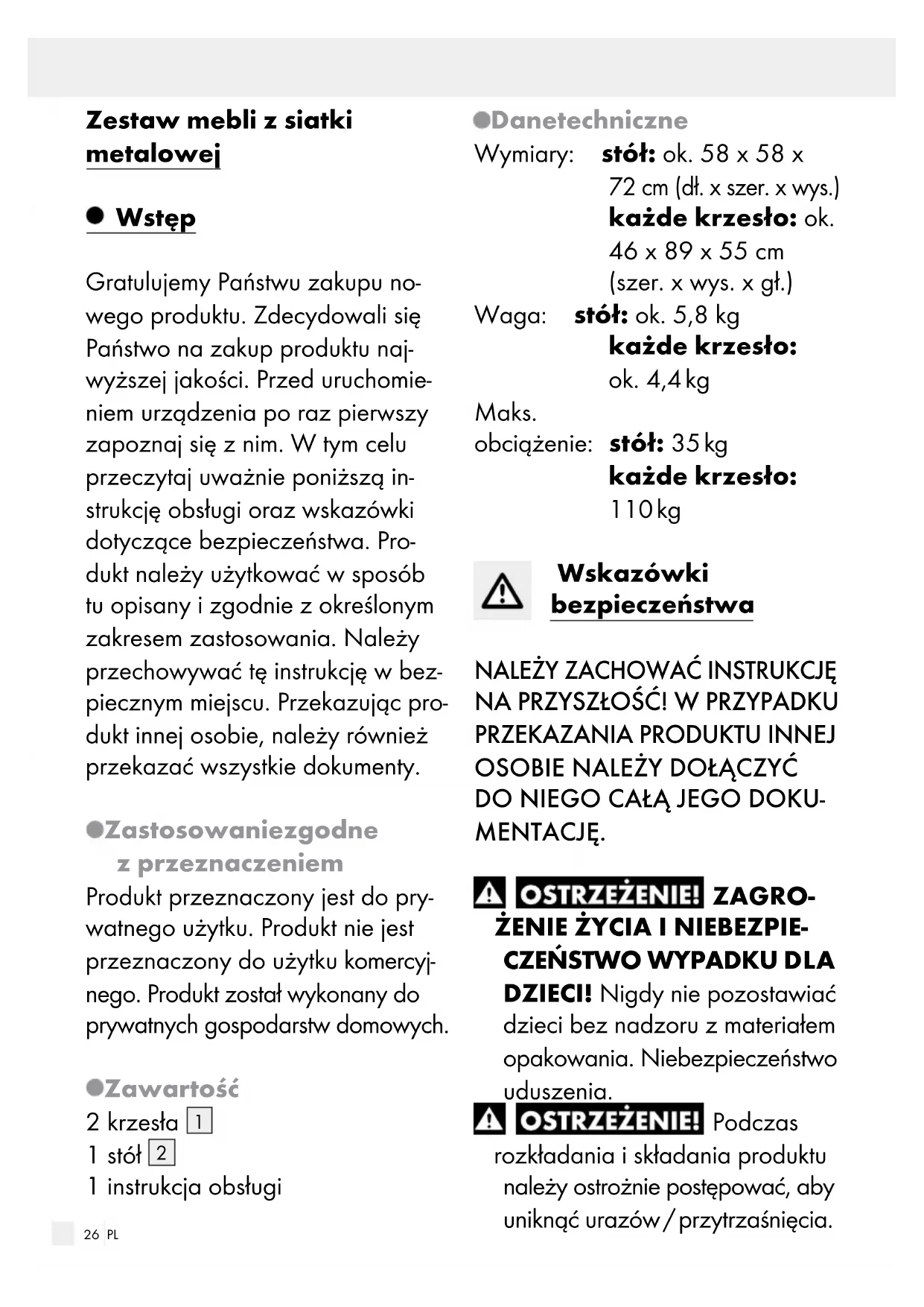 1 instrukcja obsługi Dane techniczne Wymiary: stół: ok. 58 x 58 x 72 cm (dł. x szer. x wys.) każde krzesło: ok. 46 x 89 x 55 cm (szer. x wys. x gł.) Waga: stół: ok. 5,8 kg każde krzesło: ok. 4,4 kg Maks. obciążenie: stół: 35 kg każde krzesło: 110 kg Wskazówki bezpieczeństwa