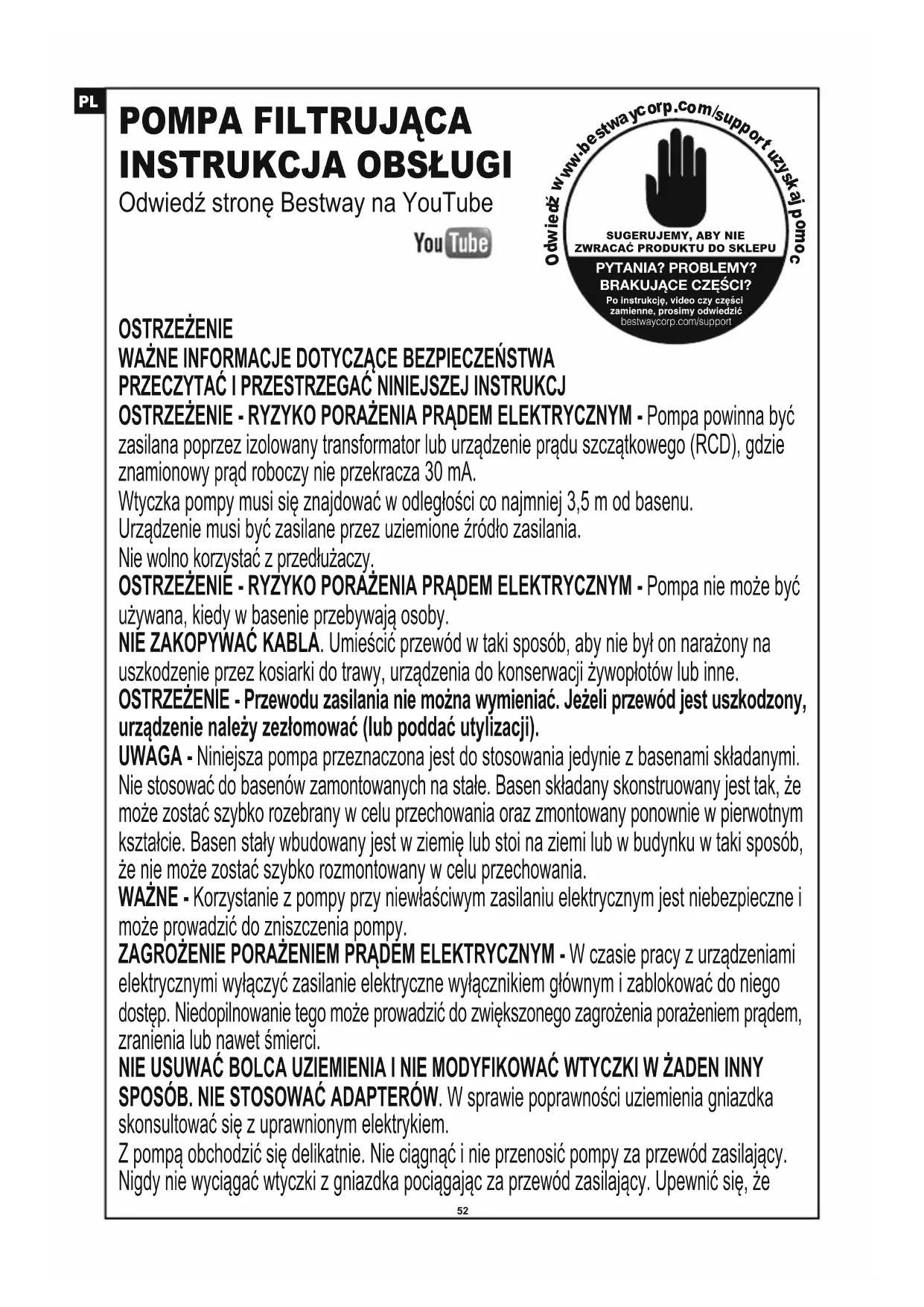 OSTRZEŻENIE - RYZYKO PORAŻENIA PRĄDEM ELEKTRYCZNYM - Pompa powinna być zasilana poprzez izolowany transformator lub urządzenie prądu szczątkowego (RCD), gdzie znamionowy prąd roboczy nie przekracza 30 mA. Wtyczka pompy musi się znajdować w odległości co najmniej 3,5 m od basenu. Urządzenie musi być zasilane przez uziemione źródło zasilania. Nie wolno korzystać z przedłużaczy. OSTRZEŻENIE - RYZYKO PORAŻENIA PRĄDEM ELEKTRYCZNYM - Pompa nie może być używana, kiedy w basenie przebywają osoby. NIE ZAKOPYWAĆ KABLA. Umieścić przewód w taki sposób, aby nie był on narażony na uszkodzenie przez kosiarki do trawy, urządzenia do konserwacji żywopłotów lub inne. OSTRZEŻENIE - Przewodu zasilania nie można wymieniać. Jeżeli przewód jest uszkodzony, urządzenie należy zezłomować (lub poddać utylizacji). UWAGA - Niniejsza pompa przeznaczona jest do stosowania jedynie z basenami składanymi. Nie stosować do basenów zamontowanych na stałe. Basen składany skonstruowany jest tak, że może zostać szybko rozebrany w celu przechowania oraz zmontowany ponownie w pierwotnym kształcie. Basen stały wbudowany jest w ziemię lub stoi na ziemi lub w budynku w taki sposób, że nie może zostać szybko rozmontowany w celu przechowania. WAŻNE - Korzystanie z pompy przy niewłaściwym zasilaniu elektrycznym jest niebezpieczne i może prowadzić do zniszczenia pompy. ZAGROŻENIE PORAŻENIEM PRĄDEM ELEKTRYCZNYM - W czasie pracy z urządzeniami elektrycznymi wyłączyć zasilanie elektryczne wyłącznikiem głównym i zablokować do niego dostęp. Niedopilnowanie tego może prowadzić do zwiększonego zagrożenia porażeniem prądem, zranienia lub nawet śmierci. NIE USUWAĆ BOLCA UZIEMIENIA I NIE MODYFIKOWAĆ WTYCZKI W ŻADEN INNY SPOSÓB. NIE STOSOWAĆ ADAPTERÓW. W sprawie poprawności uziemienia gniazdka skonsultować się z uprawnionym elektrykiem. Z pompą obchodzić się delikatnie. Nie ciągnąć i nie przenosić pompy za przewód zasilający. Nigdy nie wyciągać wtyczki z gniazdka pociągając za przewód zasilający. Upewnić się, że przewód nie jest zaplątany. Chronić przewód przed uszkodzeniem izolacji. Należy nie dopuszczać do oddziaływania ostrych przedmiotów, oleju, części ruchomych oraz ciepła na pompę z filtrem. OSTRZEŻENIE - Niniejsze urządzenie może być użytkowane przez dzieci od 8 roku życia oraz osoby z ograniczonymi zdolnościami fizycznymi, zmysłowymi lub psychicznymi lub z brakiem doświadczenia i wiedzy, tylko jeśli zapewniony jest im nadzór lub instrukcje dotyczące użytkowania sprzętu w sposób bezpieczny i rozumieją związane z tym zagrożenia. Dzieci nie powinny bawić się urządzeniem. Czyszczenie oraz konserwacja nie może być wykonywana przez dzieci bez nadzoru. (Dla rynku UE) OSTRZEŻENIE - Osoby (w tym dzieci) o ograniczonej sprawności fizycznej, sensorycznej i umysłowej oraz osoby nieposiadające dostatecznej wiedzy albo wystarczającego doświadczenia mogą używać tego urządzenia tylko pod opieką lub pod warunkiem, że zostały poinstruowane, przez osobę odpowiedzialną za ich bezpieczeństwo, o bezpiecznym sposobie używania urządzenia. Dzieci powinny być nadzorowane w celu upewnienia się, że nie bawią się tym produktem. (Dla rynku innego niż UE) Czyszczenie i konserwacja muszą być wykonywane przez osobę dorosłą - w wieku powyżej 18 roku życia, która jest świadoma ryzyka porażenia prądem elektrycznym. W dłuższych okresach w których produkt nie jest używany, na przykład w zimie, zestaw basenowy powinien być demontowany i przechowywany wewnątrz. UWAGA - Przed użyciem tego urządzenia zapoznaj się z instrukcją i montuj/składaj na nowo produkt przed każdym użyciem. To urządzenie musi znajdować się w odległości większej niż 2m od basenu.(Tylko dla Francji). Instalacje elektryczne powinny być przeprowadzane w zgodzie z krajowymi przepisami układania przewodów. W przypadku pytań skonsultuj się z wykwalifikowanym elektrykiem. Do montażu produktu należy używać wyłącznie narzędzi załączonych lub określonych przez producenta. Konieczne jest sprawdzenie, czy otwory zasysające nie są zamknięte. Podczas operacji konserwacji przeprowadzanych na systemie filtrującym zaleca się zatrzymanie filtrowania. Regularnie sprawdzaj stopień zapchania filtra. Zaleca się cotygodniowe kontrolowanie stanu filtra w celu przeprowadzenia ewentualnego czyszczenia. W celu zapewnienia czystej wody zaleca się jej codzienne, 8-godzinne filtrowanie. Należy wymienić każdy zniszczony element lub zestaw elementów tak szybko jak tylko jest to możliwe. Należy używać wyłącznie części zatwierdzonych przez osobę odpowiedzialną za wprowadzenie produktu na rynek. Wszystkie filtry i media filtracyjne powinny być regularnie kontrolowane w celu zapewnienia, że nie nagromadziły się w nich zanieczyszczenia, mogłoby to utrudniać prawidłową filtrację wody. Utylizacja jakichkolwiek zużytych mediów filtrujących powinna odbywać się w sposób zgodny z obowiązującymi regulacjami/przepisami. W przypadku jakichkolwiek wątpliwości dotyczących pompy czy jakichkolwiek innych elementów układu obiegu wody, skontaktuj się ze specjalistą lub producentem/importerem/dystrybutorem. Instalacja obiegu wody powinna być zgodna z Europejskimi oraz krajowymi/lokalnymi przepisami, przede wszystkim jeśli jest ona związana z elementami elektrycznymi. Każda zmiana położenia zaworów, zmiana rozmiaru pompy czy krat, może spowodować zmianę strumienia przepływu i zwiększenie mocy ssania. Należy przestrzegać wszystkich wymogów bezpieczeństwa i zaleceń zamieszczonych w instrukcji obsługi. UWAGA: Przed użyciem sprawdzić urządzenie. Jeśli w czasie zakupu stwierdzono występowanie brakujących lub uszkodzonych części prosimy o poinformowanie o tym serwisu konsumenckiego firmy Bestway na adres podany w niniejszej instrukcji. Prosimy o sprawdzenie czy wszystkie części