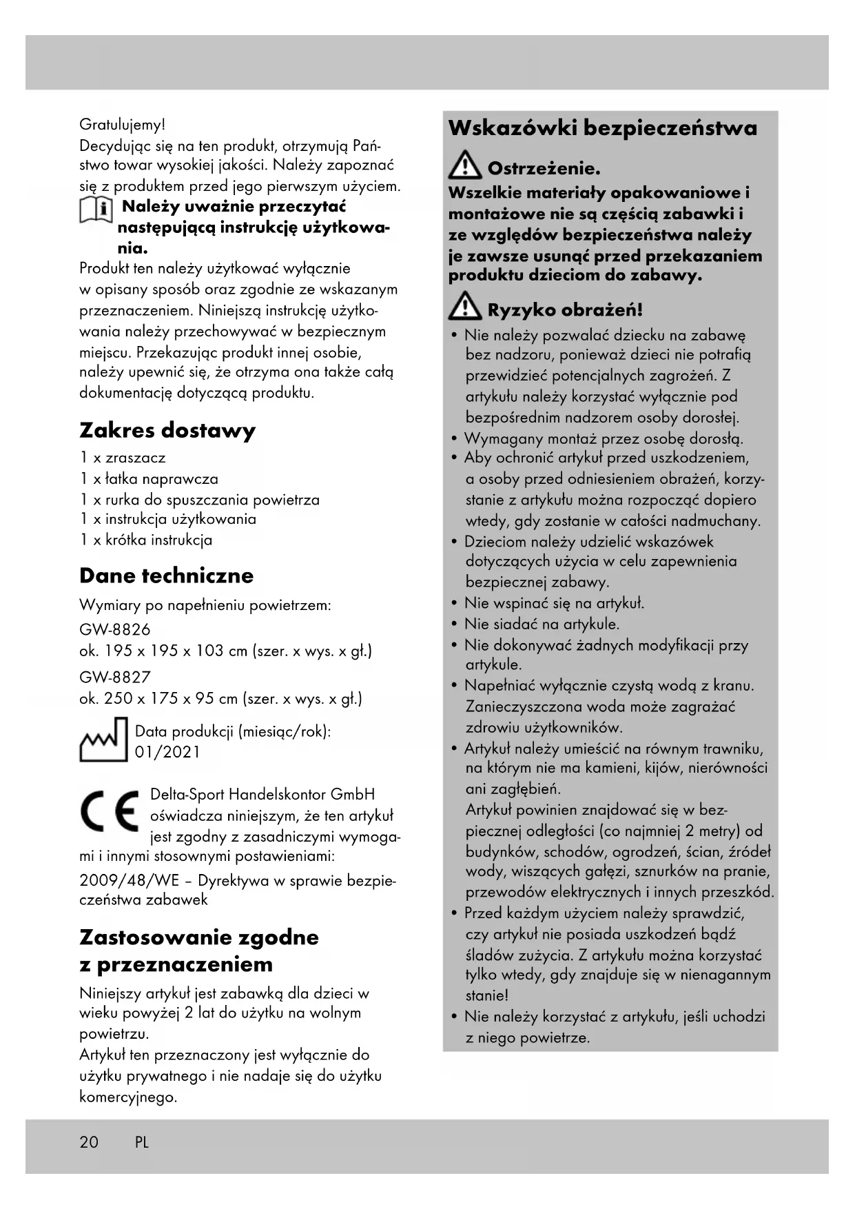uszkodzone miejsce i mocno docisnąć. Przechowywanie, czyszcze- nie Podczas nieużywania należy zawsze przecho- wywać nienapompowany artykuł w suchym i czystym miejscu w temperaturze pokojowej. W trakcie przechowywania zawory muszą być przez cały czas zamknięte. Artykuł czyścić tylko wodą lub wodą z mydłem, nigdy przy użyciu ostrych środków czyszczących. Podczas przechowywania przez zimę nie umieszczać na artykule żadnych ostrych przedmiotów i nie posypywać talkiem. Uwagi odnośnie recyklingu Artykuł oraz materiały opakowaniowe nale- ży usunąć zgodnie z aktualnymi przepisami obowiązującymi w danym miejscu. Materiały opakowaniowe, jak np. worki foliowe nie powinny znaleźć się w rękach dzieci. Materiał opakowaniowy należy przechowywać w miej- scu niedostępnym dla dzieci. Zutylizować produkt i opakowanie w sposób przyjazny dla środowiska. Kod materiału do recyklingu służy do oznaczenia różnych materiałów przeznaczonych do zwrotu do przetwór- stwa wtórnego (recyklingu). Kod składa się z symbolu, który powinien odzwierciedlać cykl odzysku, oraz numeru oznaczającego materiał. PL23 Wskazówki dotyczące gwa- rancji i obsługi serwisowej Produkt został wyprodukowany bardzo staran- nie i podczas stałej kontroli. Państwo otrzymują na ten produkt trzy lata gwarancji od daty zakupu. Prosimy o zachowanie paragonu. Gwarancja obejmuje tylko błędy materiałowe lub fabryczne i traci ważność podczas używa- nia produktu nie właściwie i nie zgodnie z jego przeznaczeniem. Państwa prawa, w szczególno- ści zasady odpowiedzialności z tytułu rękojmi, nie zostaną ograniczone tą gwarancję. W razie ewentualnych reklamacji należy skontaktować się pod niżej podanym numerem infolinii lub po- przez pocztę elektroniczną. Nasi współpracow- nicy omówią z Państwem jak najszybciej dalszy przebieg sprawy. Z naszej strony gwarantujemy doradztwo. W przypadku wymiany części lub całego arty- kułu okres gwarancji przedłuża się o trzy lata zgodnie z art. 581 § 1 kodeksu cywilnego. Po upłynięciu czasu gwarancji powstałe naprawy są płatne. IAN: 361427_2007 Serwis Polska Tel.: 22 397 4996 E-Mail: deltasport@lidl.pl PL24 CZ Srdečně blahopřejeme! Svým nákupem jste se rozhodli pro kvalitní výro- bek. Před prvním použitím se prosím seznamte s tímto výrobkem. Pozorně si přečtete následující návod k použití. Používejte tento výrobek pouze tak, jak je popsáno, a pro uvedené účely. Uschovejte si tento návod k použití pro budoucí použití. Pokud výrobek předáte třetí osobě, předejte jí i veške- rou dokumentaci. Rozsah dodávky 1 x vodní postřikovač 1 x záplata na opravu 1 x vypouštěcí trubička 1 x návod k použití 1 x krátký návod Technická data Rozměry (nafouknuto): GW-8826 cca 195 x 195 x 103 cm (š x v x hl.) GW-8827 cca 250 x 175 x 95 cm (š x v x hl.) Datum výroby (měsíc/rok): 01/2021 Delta-Sport Handelskontor GmbH tímto prohlašuje, že tento výrobek je ve shodě s následujícími základními požadavky a ostatními příslušnými ustanoveními: 2009/48/EU – směrnice o hračkách Použití ke stanovenému účelu Tento výrobek je hračka pro děti od 2 let pro venkovní použití. Výrobek je určen pouze pro privátní potřebu a nikoli pro podnikatelské použití. Bezpečnostní pokyny Upozornění. Všechny obalové a upevňovací materi- ály nejsou součástí hračky a musí být z bezpečnostních důvodů vždy odstra- něny před tím, než výrobek předáte dětem na hraní. Nebezpečí úrazu!