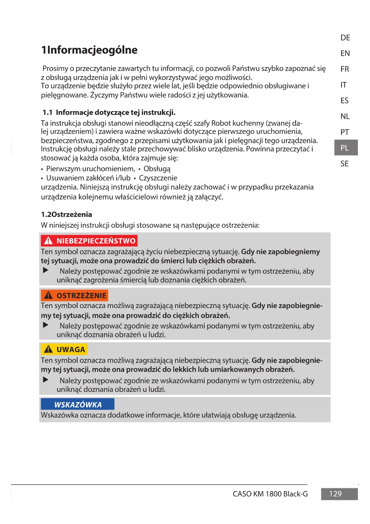 W niniejszej instrukcji obsługi stosowane są następujące ostrzeżenia: NIEBEZPIECZEŃSTWO Ten symbol oznacza zagrażającą życiu niebezpieczną sytuację. Gdy nie zapobiegniemy tej sytuacji, może ona prowadzić do śmierci lub ciężkich obrażeń. Należy postępować zgodnie ze wskazówkami podanymi w tym ostrzeżeniu, aby uniknąć zagrożenia śmiercią lub doznania ciężkich obrażeń. OSTRZEŻENIE Ten symbol oznacza możliwą zagrażającą niebezpieczną sytuację. Gdy nie zapobiegnie- my tej sytuacji, może ona prowadzić do ciężkich obrażeń. Należy postępować zgodnie ze wskazówkami podanymi w tym ostrzeżeniu, aby uniknąć doznania obrażeń u ludzi. UWAGA Ten symbol oznacza możliwą zagrażającą niebezpieczną sytuację. Gdy nie zapobiegnie- my tej sytuacji, może ona prowadzić do lekkich lub umiarkowanych obrażeń. Należy postępować zgodnie ze wskazówkami podanymi w tym ostrzeżeniu, aby uniknąć doznania obrażeń u ludzi. WSKAZÓWKA Wskazówka oznacza dodatkowe informacje, które ułatwiają obsługę urządzenia.130 CASO KM 1800 Black-G